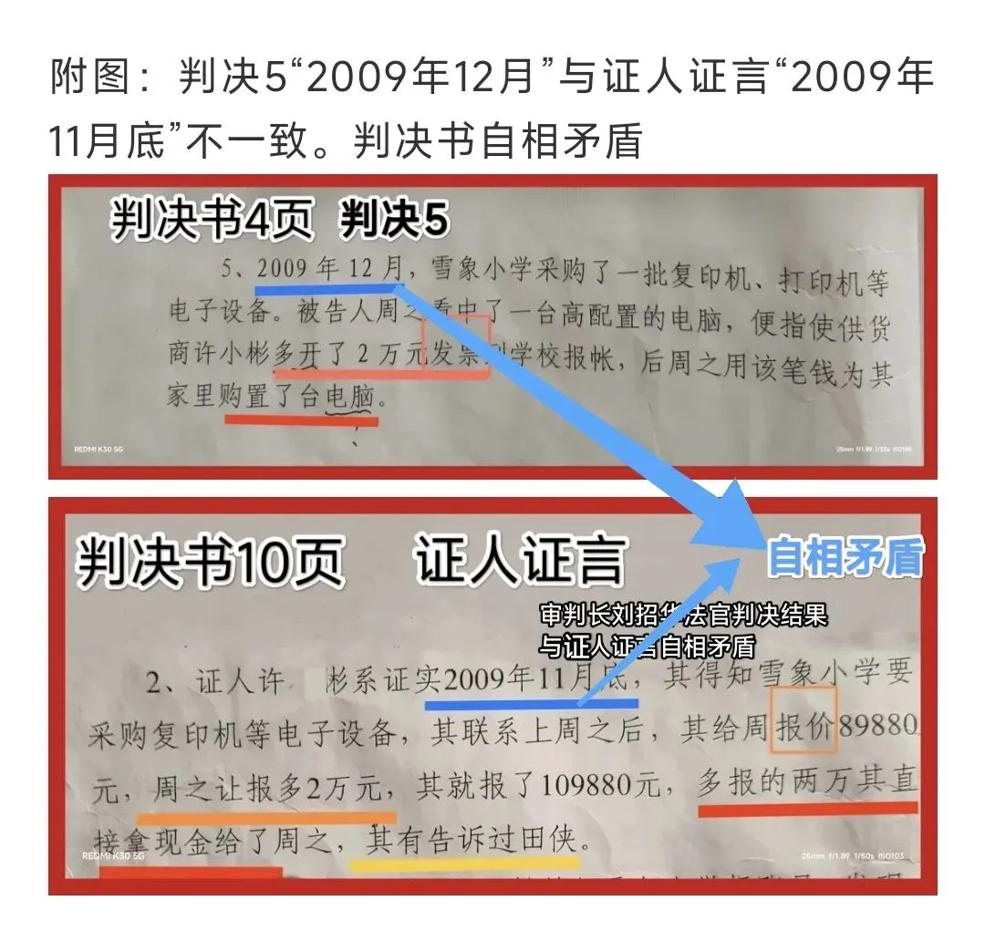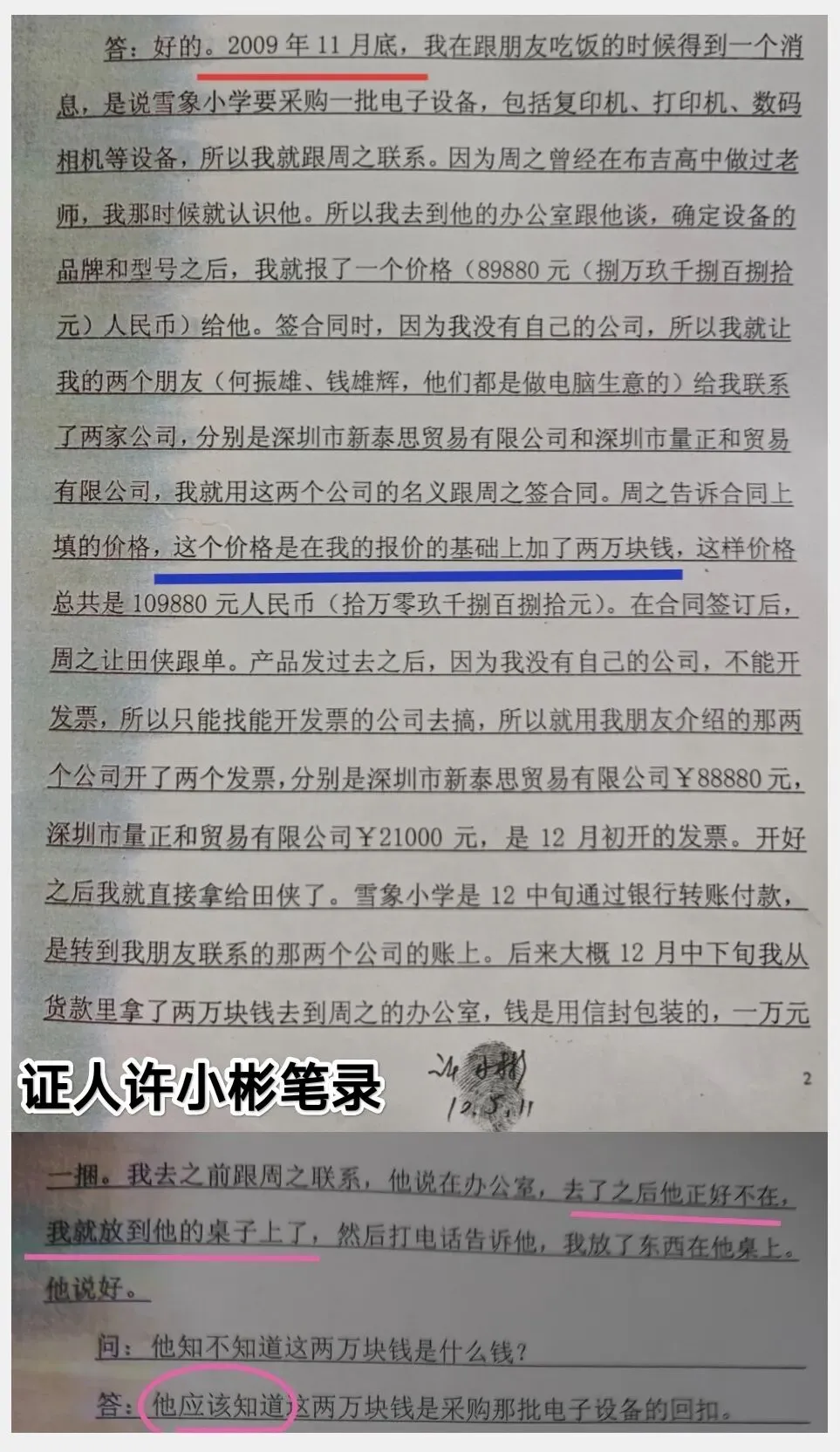 2.系统性篡改证人证言已达伪造证据罪标准:①在证人笔录中,校长要求“合同上的价格在供货商报价基础上加了两万块”,但法院证人证言却变成了“校长让报多2万元”;②证人笔录中“拿了两万块去校长办公室,校长不在…放在校长办办桌上了…”的描述被篡改为“多报的两万直接拿现金给了校长”;③证人田笔录中的“听…说”被改为“所说一致”。