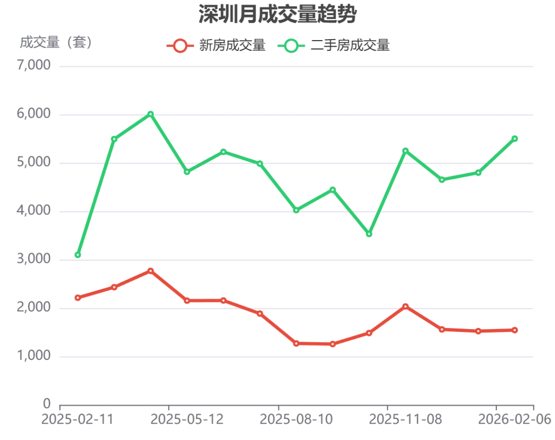 最新的市场数据,描绘出一幅“总量平稳、结构分化”的复杂图景。截至今年2月6日,深圳新房与二手房总共成交了7042套。这个数字,放在近一年的时间轴上看,处于中等偏上的位置,市场并未失速。