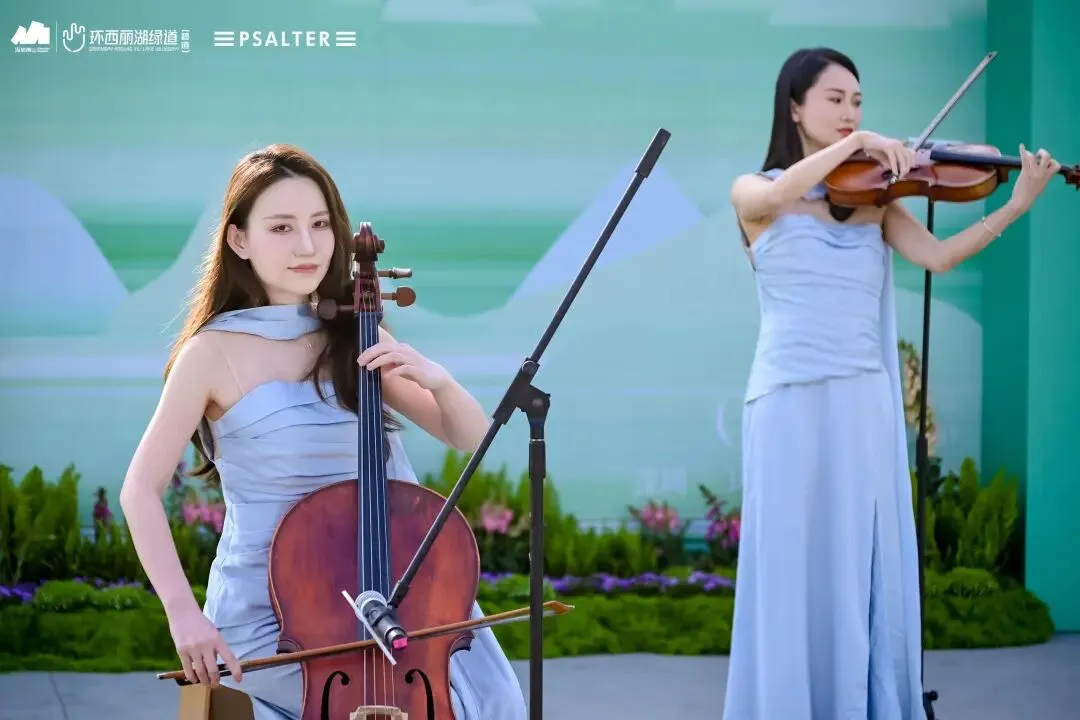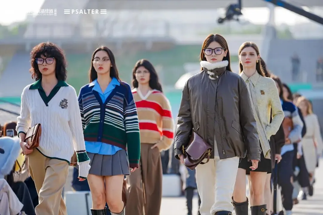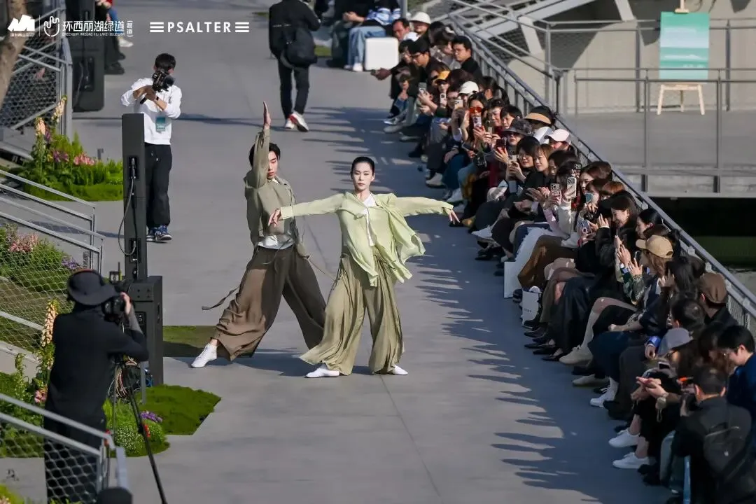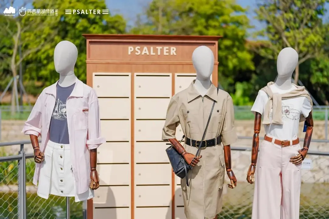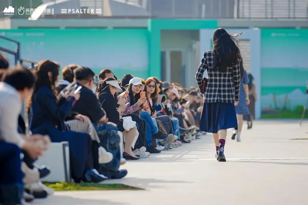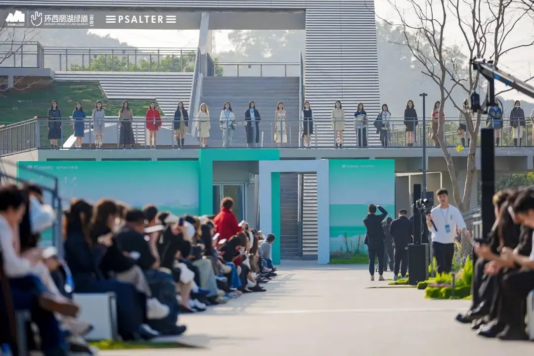 不同于钢筋水泥的封闭秀场,环西丽湖绿道(碧道)的“绿野秀场”全程“无界”:秀道从开阔广场蜿蜒至湖畔,模特行走间与山水肌理呼应;静态展陈区里,PSALTER诗篇服装与绿植相映成趣,形成“衣在景中、景随衣动”的画面;观众既能驻足观秀,又能漫步绿道吸氧,彻底实现“观秀+休闲”双满足。