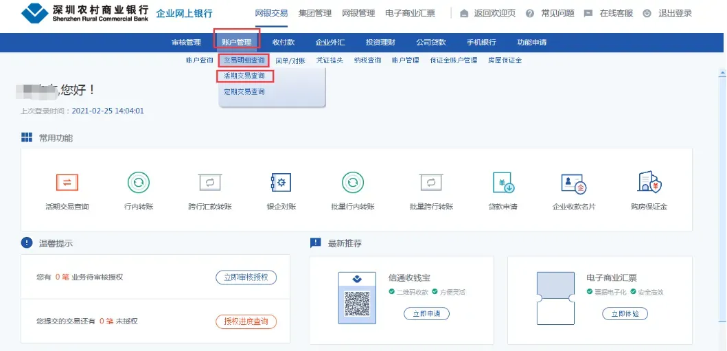 2.点击【账户管理】--【交易明细查询】--【活期交易查询】;