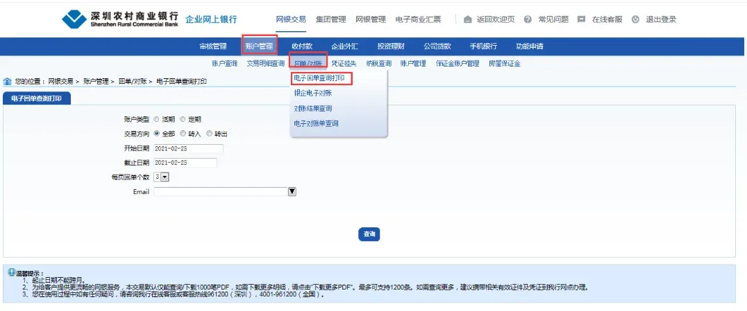 1.点击【账户管理】--【回单/对账】--【电子回单查询打印】