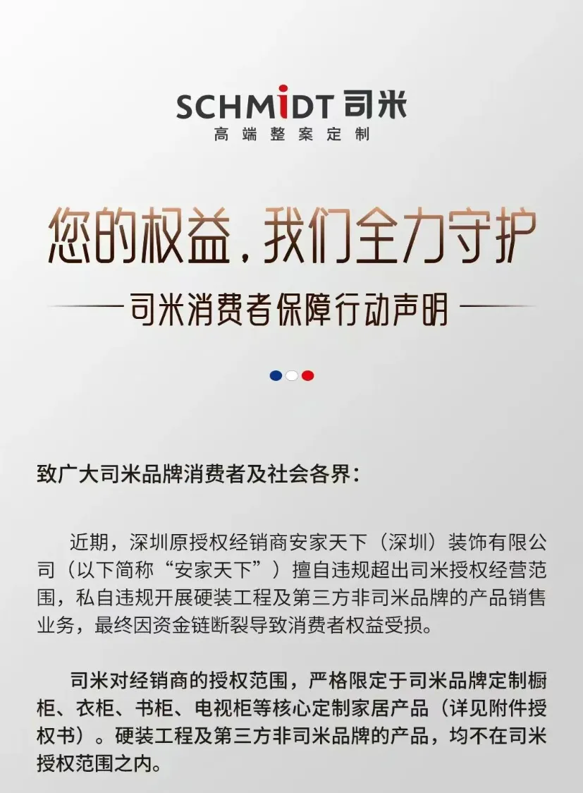 司米发布的声明指出,安家天下公司擅自违规超出司米授权经营范围,私自违规开展硬装工程及第三方非司米品牌的产品销售业务,最终因资金链断裂导致消费者权益受损。