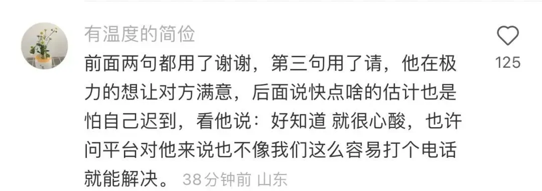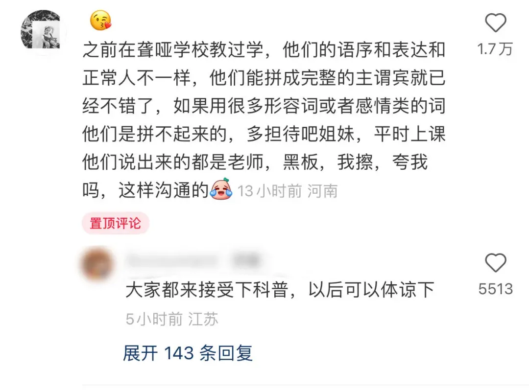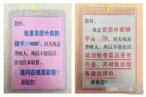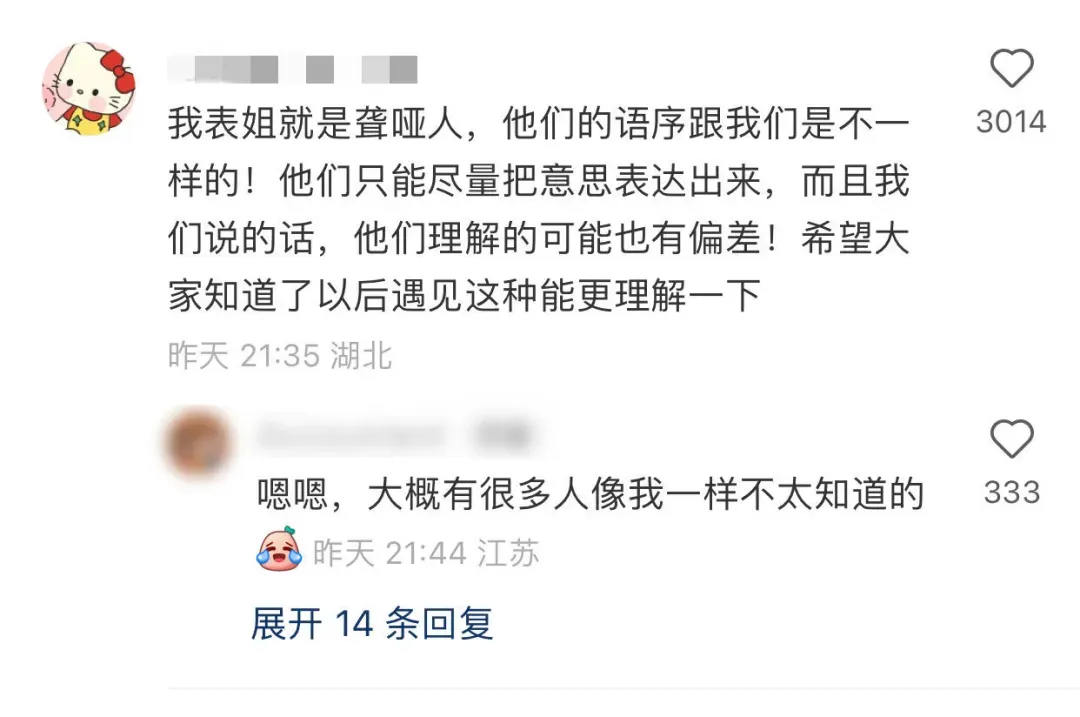 小某书上最近有个热帖,一个小姐姐称自己收到了聋哑人外卖员的短信,短信的语气让她有点生气。好在评论区里,有位曾在聋哑学校教过学的老师出来温柔地科普了:“他们的语序和表达和正常人不一样,能拼成完整的主谓宾就已经不错了。如果用很多形容词或者情感类的词他们是拼不起来的,多担待吧姐妹。”他们只能尽量把意思表达出来,而且我们说的话,他们理解的可能也有偏差!有人设身处地地代入了那位聋哑人外卖员的处境,觉得有点难过:“前面两句都用了谢谢,第三句用了请,他在极力地想让对方满意,后面说快点啥的估计也是怕自己迟到。看他说:好知道,就很心酸,也许问平台对他来说也不像我们这么容易打个电话就能解决。”是啊,对于听障人士来说,如果家庭条件较好,从小戴助听器,那语言表达方面可能和其他人没有太大的区别,但毕竟是少数。大多数听障人士的语言是非常直白的,手语的逻辑和我们的说话逻辑是有些不一样的。他们为了让世界听懂他们的语言,已经付出了比其他人更多的努力。 03