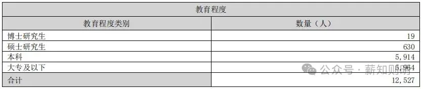 | 教育程度 | 研究生及以上学历649人(5.18%);本科 学历5,914人(47.21%);大专及以下 5,964人(47.61%) |