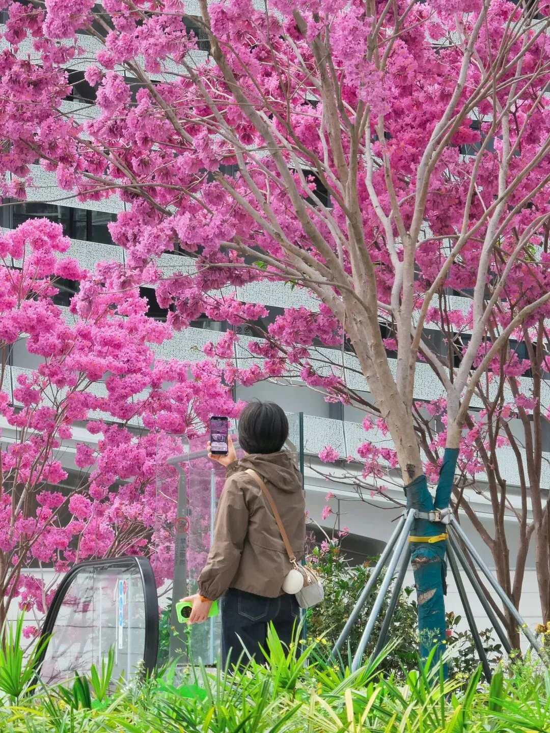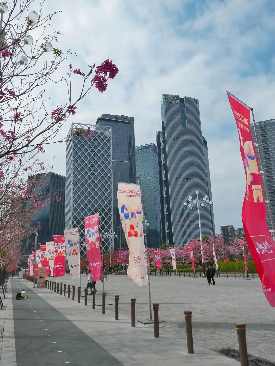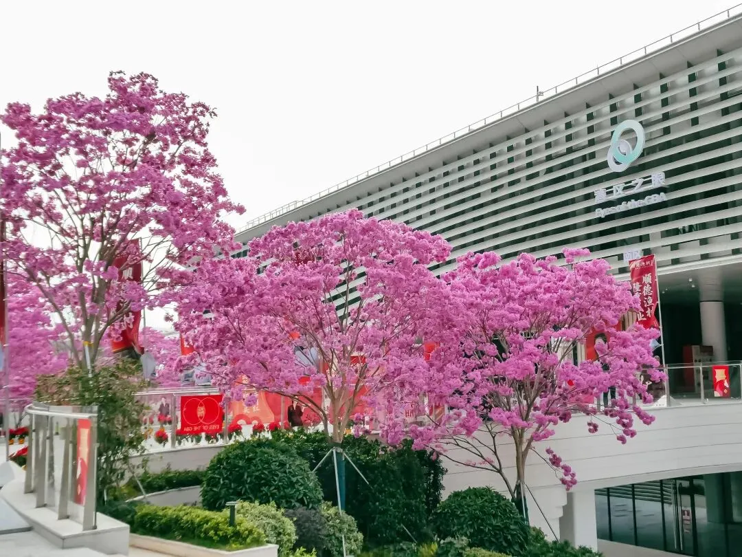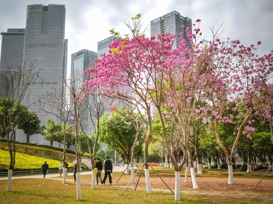 路过湾区之眼时,我被这里的景色深深吸引。这里的紫花风铃木开得最为艳丽,花团锦簇,与现代化的建筑相映成趣,形成了一幅美丽的画卷。无论是拍照打卡,还是坐在树下静静赏花,都能感受到这份独属于深圳的浪漫。