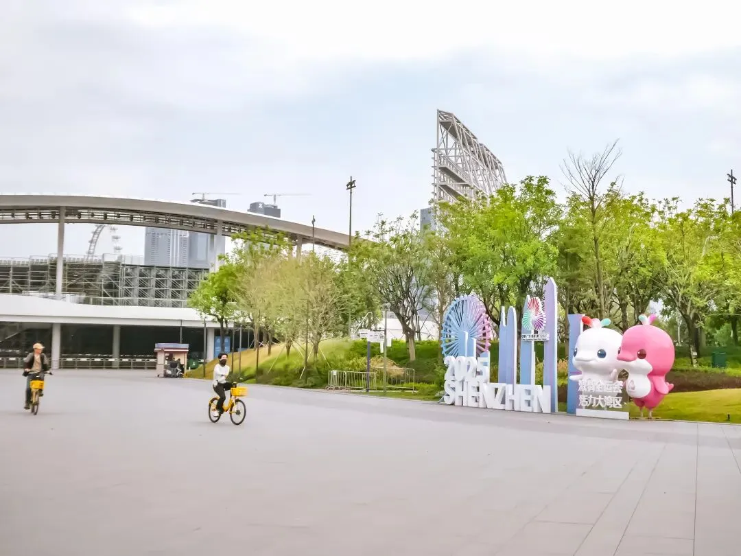 我的骑行路线从海滨广场开始,沿途经过湾区之眼、欢乐剧场,最终到达高速桥下绿道。每一处都有不同的风景,但最让我心动的,还是那些盛开的紫花风铃木。