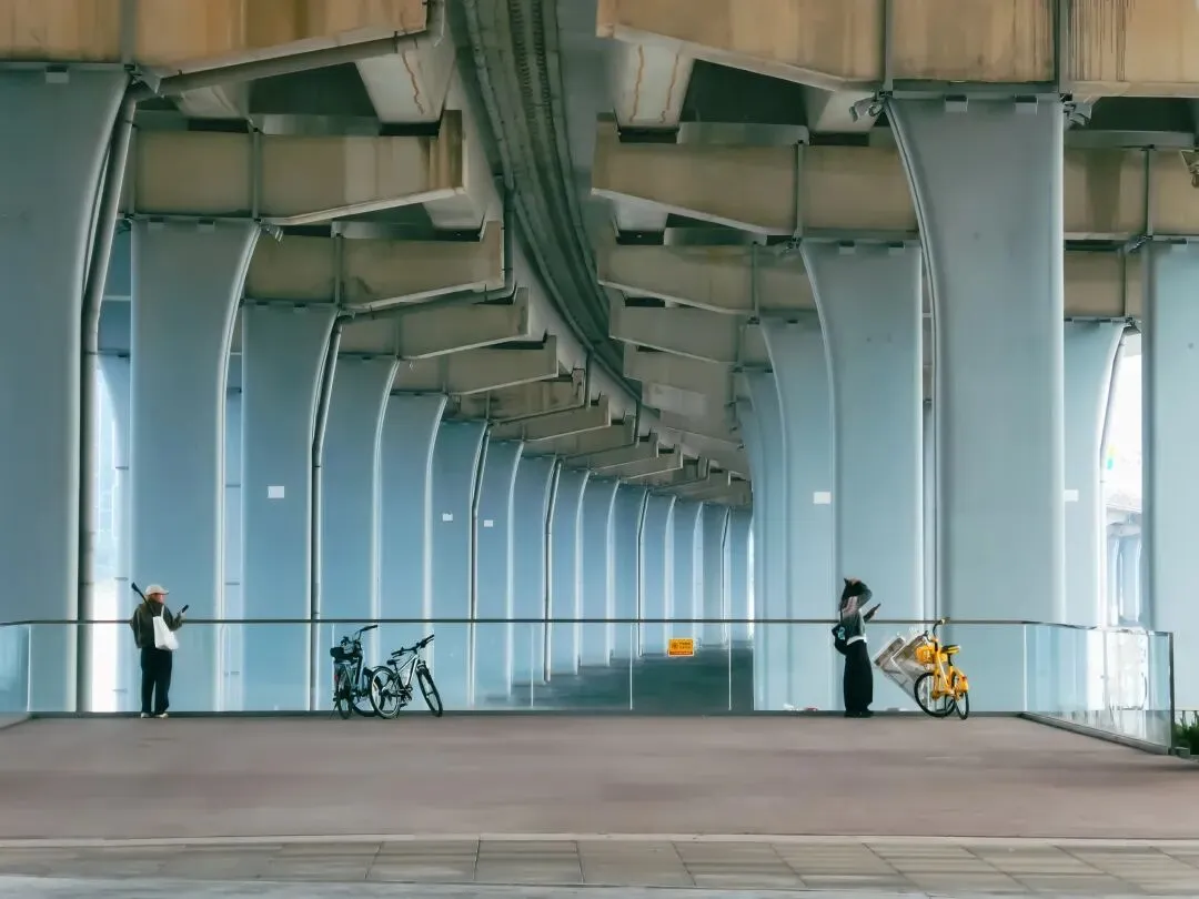 途径欢乐剧场后,我来到了高速桥下绿道。这里是我多次造访的地方,一眼望去,无限的桥墩仿佛形成了一个时空隧道,让人感受到一种独特的视觉冲击。远处,前海石的城市高楼群清晰可见,现代都市的繁华与自然景观在这里完美融合。