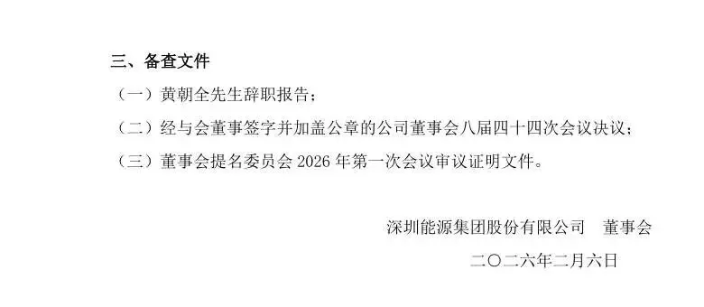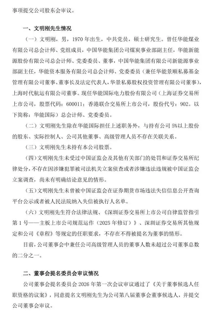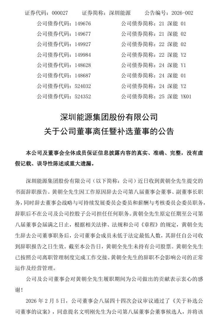 >深圳能源副董事长黄朝全辞职,文明刚成新董事候选人