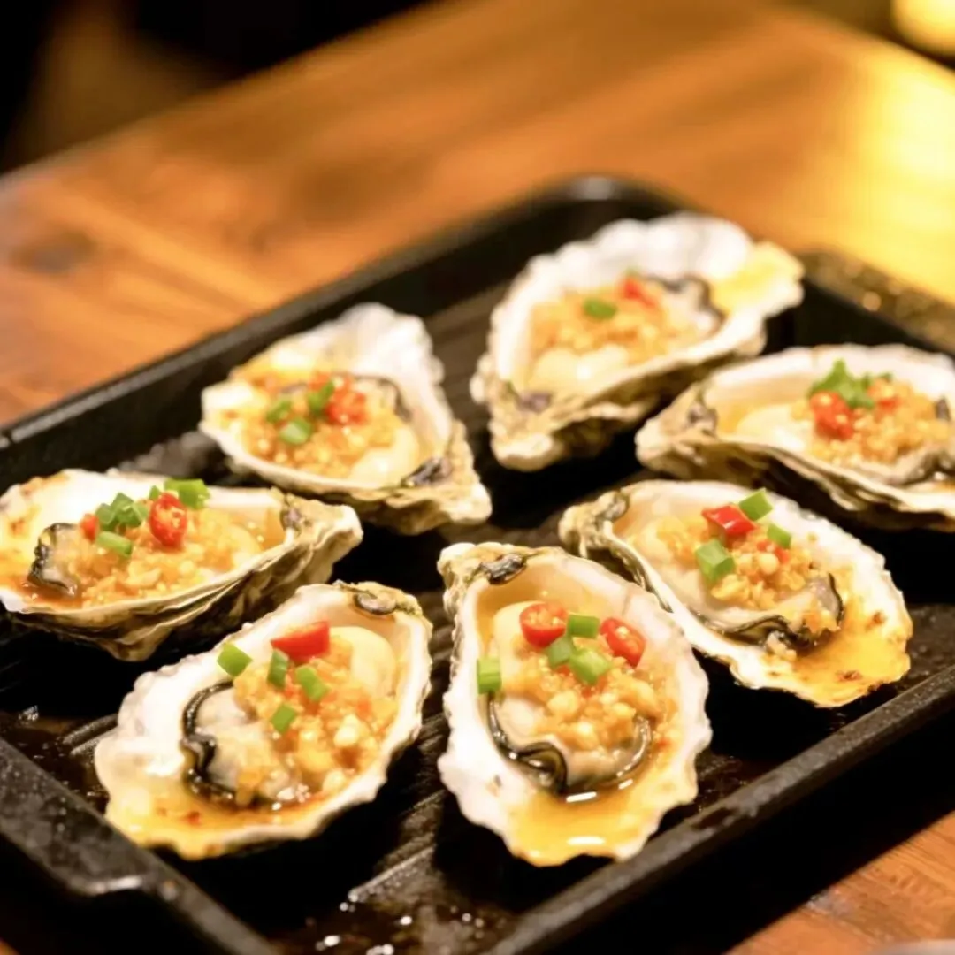 放在炭火上,随着“滋滋”的响声,蚝汁开始沸腾,铺上金黄的蒜蓉和鲜红的辣椒,一口下去,海洋的澎湃鲜甜在口中炸开,这是最直给、最豪迈的湛江味道。