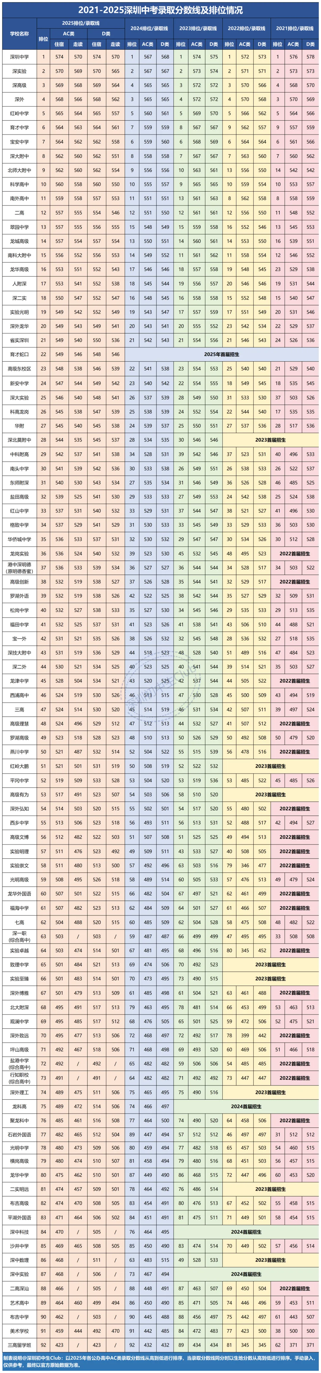 2025年深圳有92所(含三高出国班)公办普高参与中考招生,这五年间,增长了近40所公办高中。随之新高中的加入和学校发展,部分校录取排位也生了变化。本文整理了2021-2025深圳公办普高录取线排位对照表,给到初中同学及家长了解参考。
