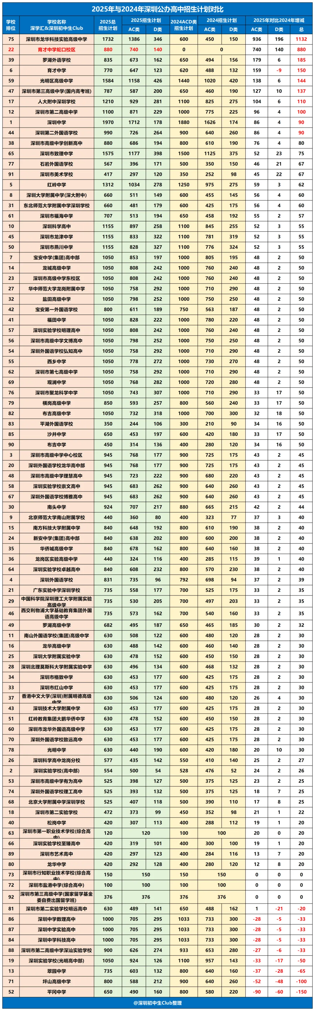 接下来,对照2025与2024深圳公办高中招生计划,可以看到各高中学位数也是有增有减。其中,龙科高2025年新增学位数量最多,高达1132个学位,其次是育才蛇口以新代码首届招生,招生计划880人。
