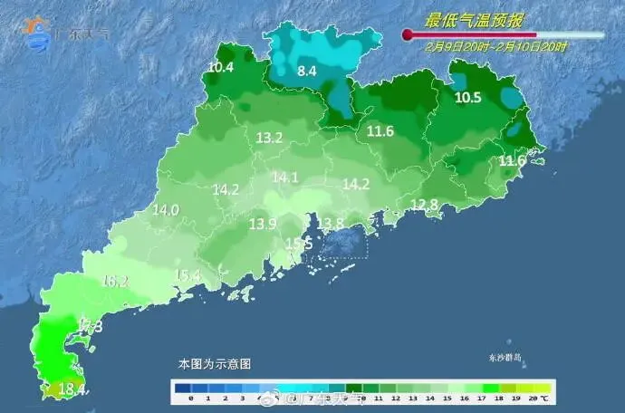 2月8日,西部市县多云到阴天,有分散小雨,其余市县多云。粤北和珠三角北部市县6℃~10℃(高海拔山区1℃~3℃),粤西市县14℃~18℃,其余市县10℃~14℃。