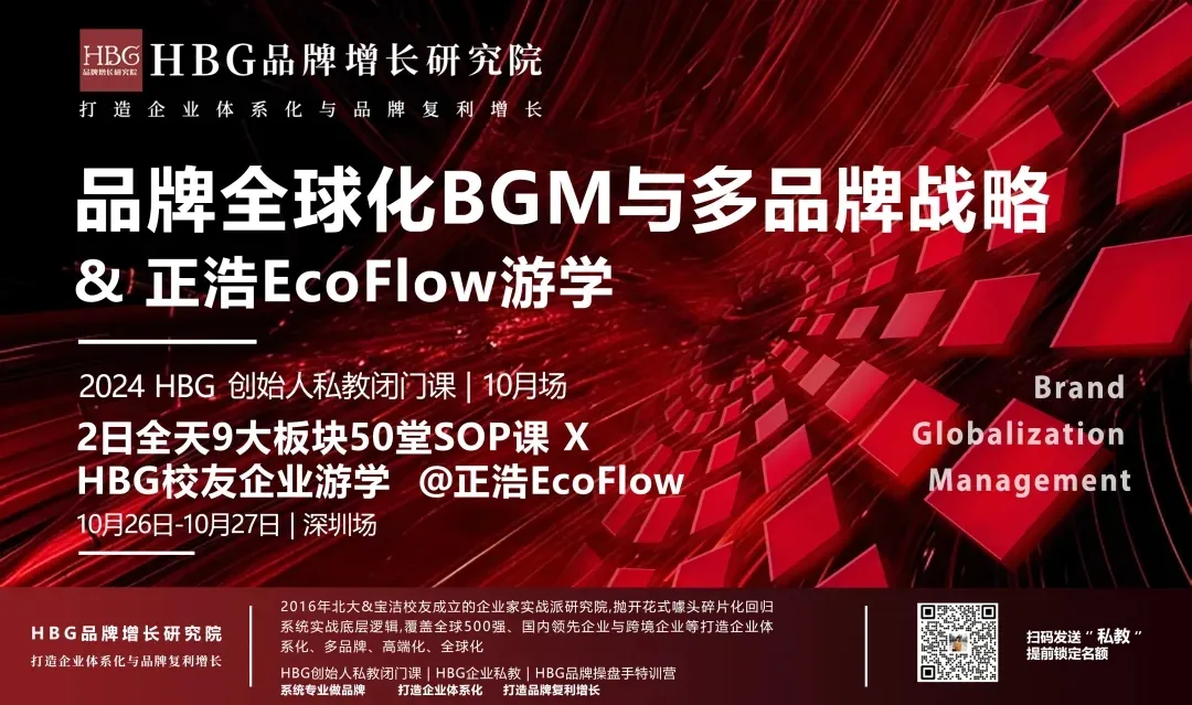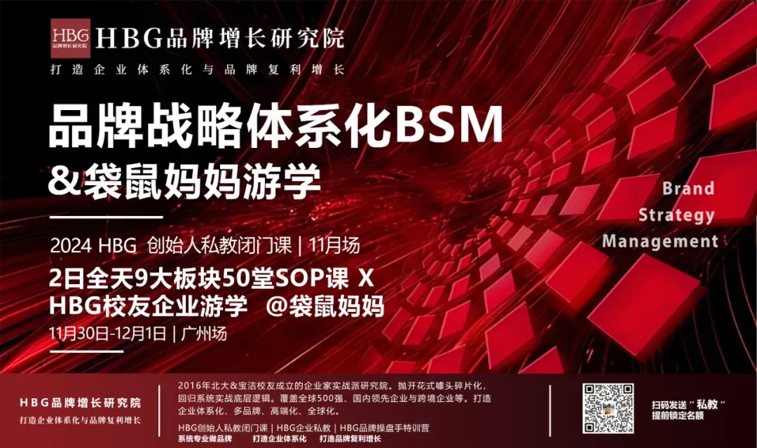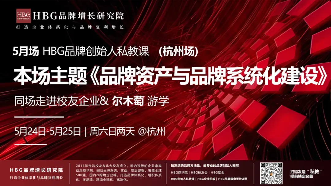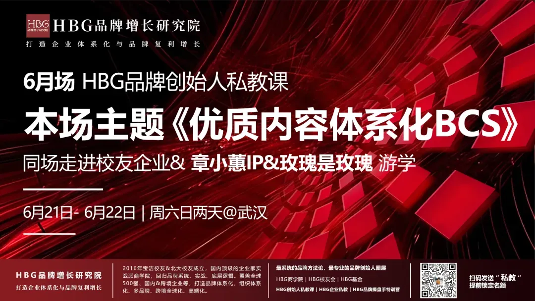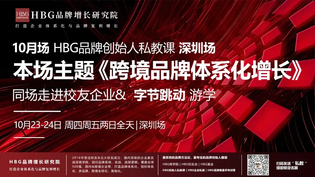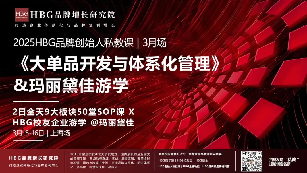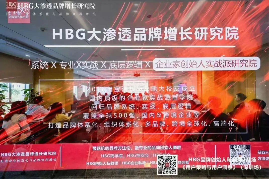 HBG是2016年由北大&宝洁校友成立的全国顶级的企业家实战派品牌研究院,齐聚全球500强外企、国内头部集团、新锐品牌、以及跨境出海品牌等各行各业创始人为主,打造品牌体系化落地实战SOP体系。HBG校友涵盖美妆、食品饮料、服饰箱包、大健康、医药、母婴、宠物、家电、科技、汽车、新能源、跨境、工厂等各行业等。包括宝洁、安克、珀莱雅、花西子、元气森林、安踏、霸王茶姬、谷雨、正浩EcoFlow、欧诗漫、京润珍珠、盐津铺子、诺特兰德、东阿阿胶、福瑞达、自由点、燕之屋、小仙炖、Wonderlab、老板电器、华润集团、九阳集团、蓝氏宠物、袋鼠妈妈、方里、章小蕙IP、毕生之研、独特艾琳、尔木萄、环球尚佰、UR、亿帆医药等等。在每年10场的HBG品牌创始人私教课当中,来自不同行业的品牌创始人,进行每场2日闭门私教课,以及跨行业交流,坦诚纯粹,不做无效社交。