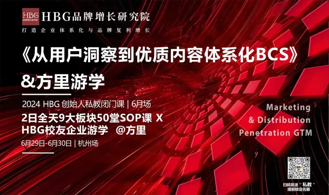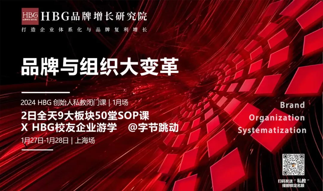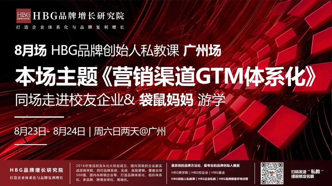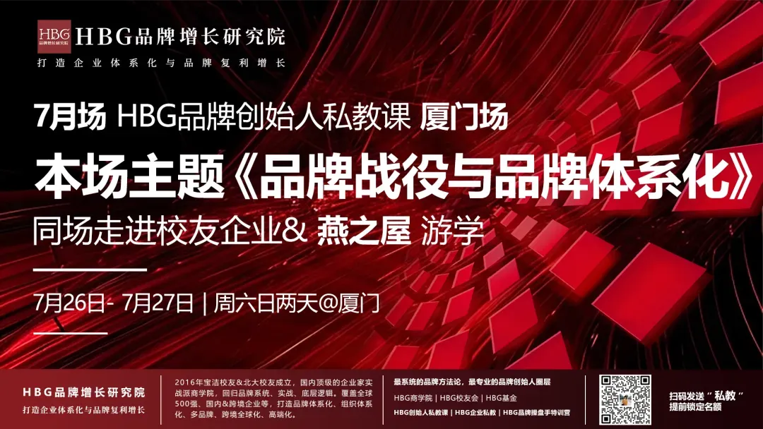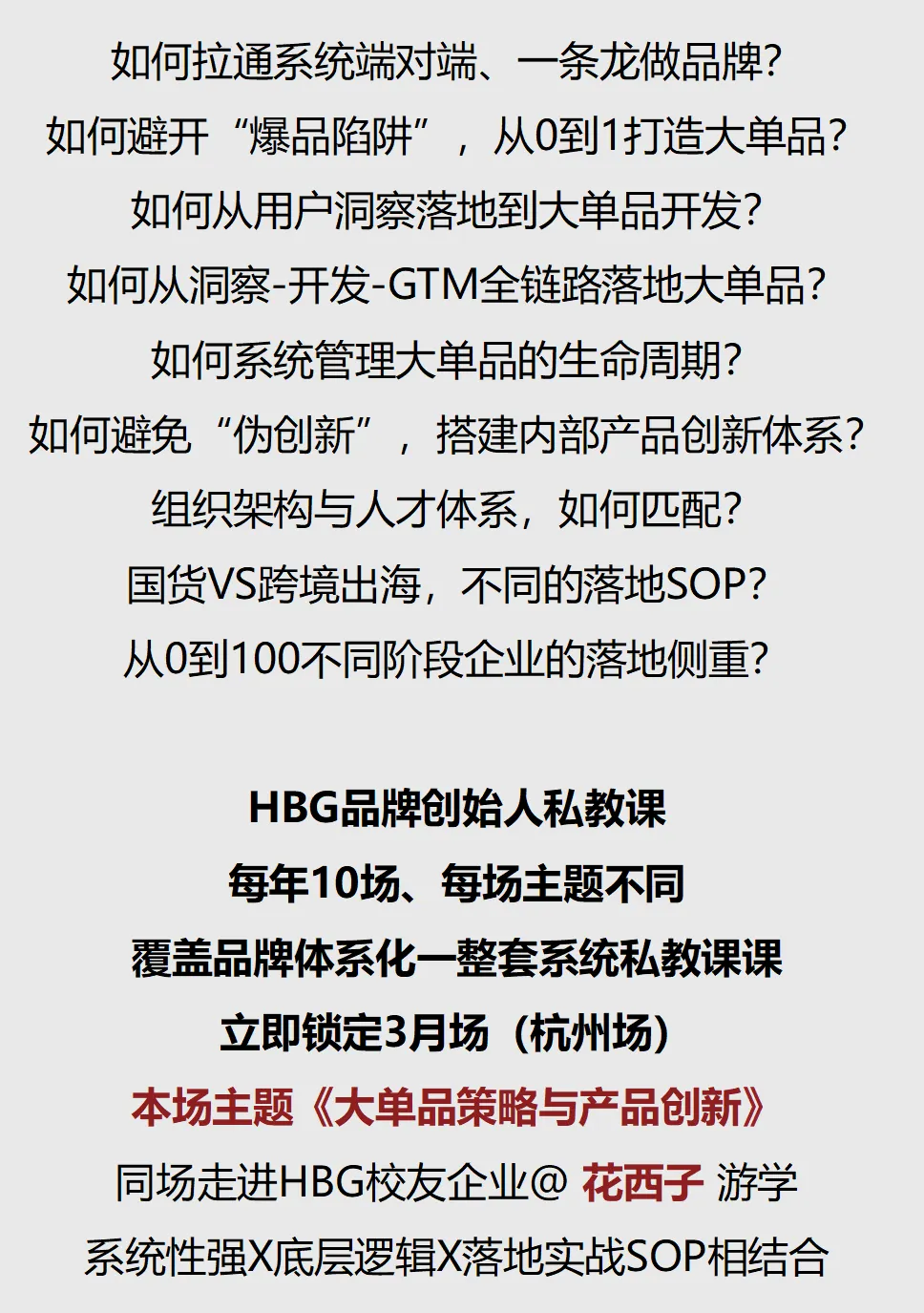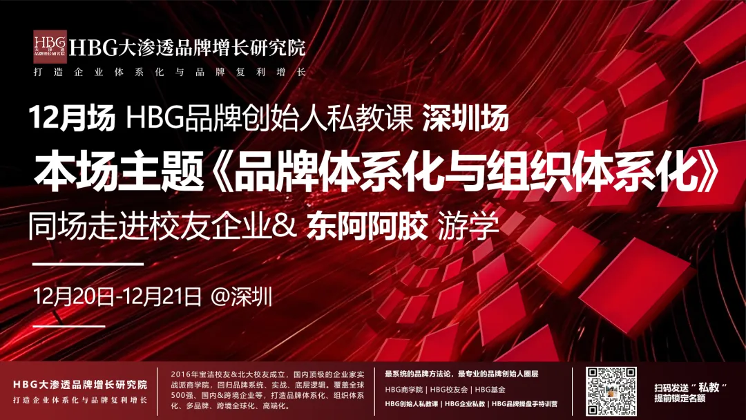 HBG是2016年由北大&宝洁校友成立的全国顶级的企业家实战派品牌研究院,齐聚全球500强外企、国内头部集团、新锐品牌、以及跨境出海品牌等各行各业创始人为主,打造品牌体系化落地实战SOP体系。HBG校友涵盖美妆、食品饮料、服饰箱包、大健康、医药、母婴、宠物、家电、科技、汽车、新能源、跨境、工厂等各行业等。包括宝洁、安克、珀莱雅、花西子、元气森林、安踏、霸王茶姬、谷雨、正浩EcoFlow、欧诗漫、京润珍珠、盐津铺子、诺特兰德、东阿阿胶、福瑞达、自由点、燕之屋、小仙炖、Wonderlab、老板电器、华润集团、九阳集团、蓝氏宠物、袋鼠妈妈、方里、章小蕙IP、毕生之研、独特艾琳、尔木萄、环球尚佰、UR、亿帆医药等等。在每年10场的HBG品牌创始人私教课当中,来自不同行业的品牌创始人,进行每场2日闭门私教课,以及跨行业交流,坦诚纯粹,不做无效社交。