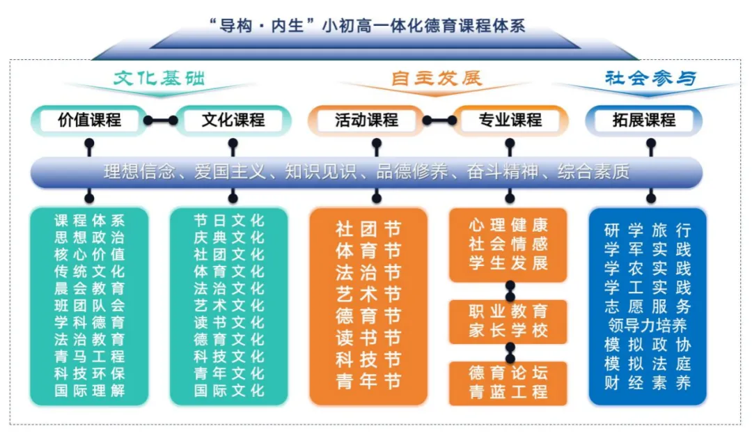 德育文化建设是学校教育的核心组成部分,我校高度重视德育文化建设,2025年我们通过构建“导构·内生”的十二年一贯制德育课程体系,将社会主义核心价值观融入育人全过程,我们营造浸润式育人环境,开展校园大德育文化建设。