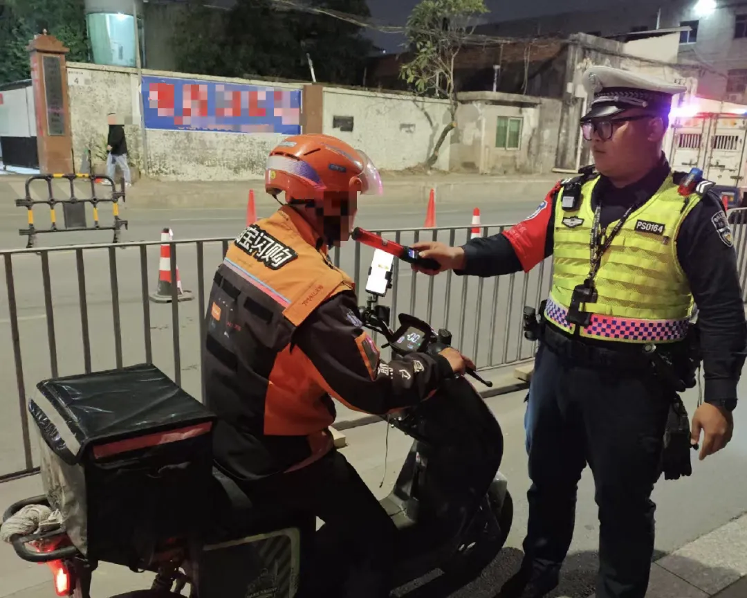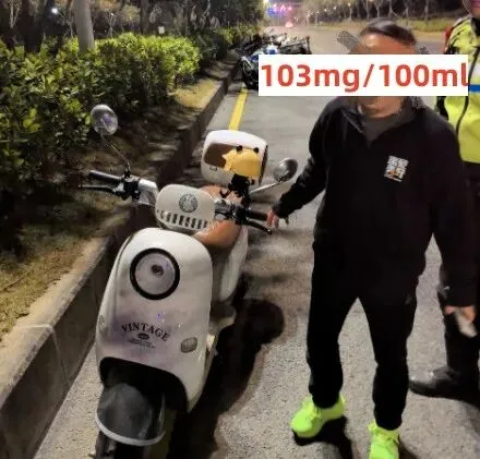 光明交警在东长路东坑社区公园路段设卡开展查酒驾整治行动时,发现一名电动车驾驶人神情紧张,靠近后有明显酒气。经对该电动车驾驶人进行呼气式酒精检测,结果为103mg/100ml,涉嫌酒后驾驶非机动车。