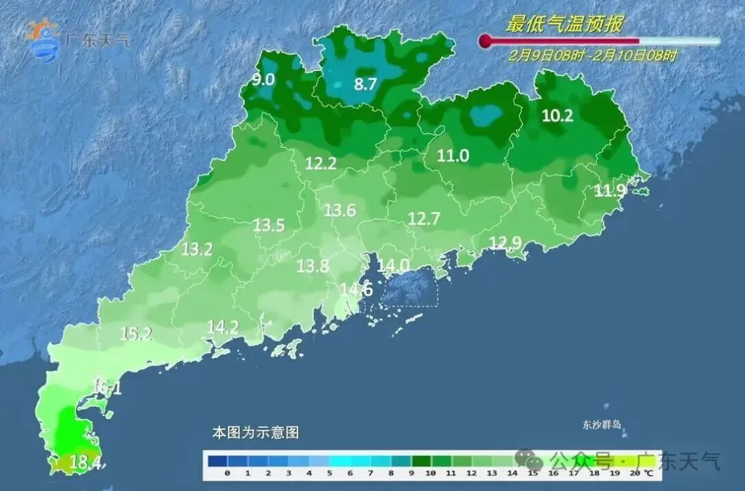 9日,粤北市县多云转小雨,其余大部市县多云间阴天,局部有小雨。最低气温:粤北市县3~7℃(高海拔山区1~3℃),粤西市县13~17℃,其余市县8~11℃。