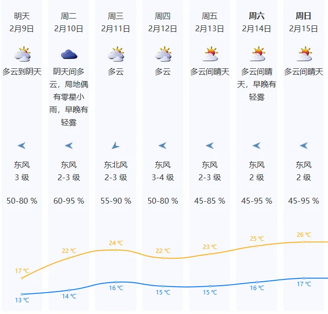 9日,多云到阴天,气温13~17℃,早晚体感较冷。