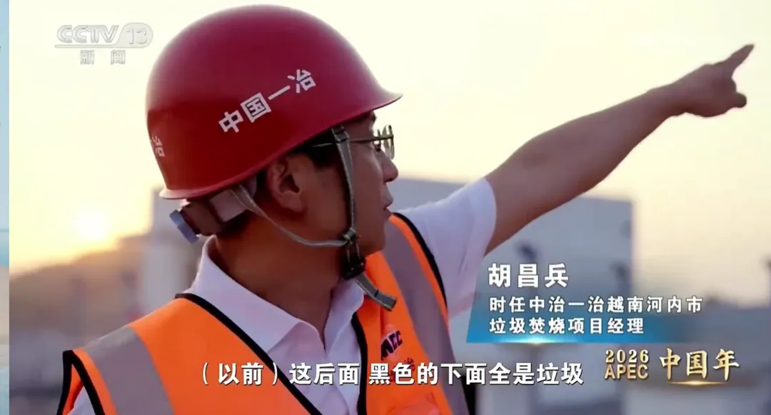 时任中治一治越南河内市垃圾焚烧项目经理 胡昌兵:(以前)就在这后面,黑色的下面全是垃圾,我当时就在想无论在哪个国家,我们用绿色的建造,让这个星球生生不息。