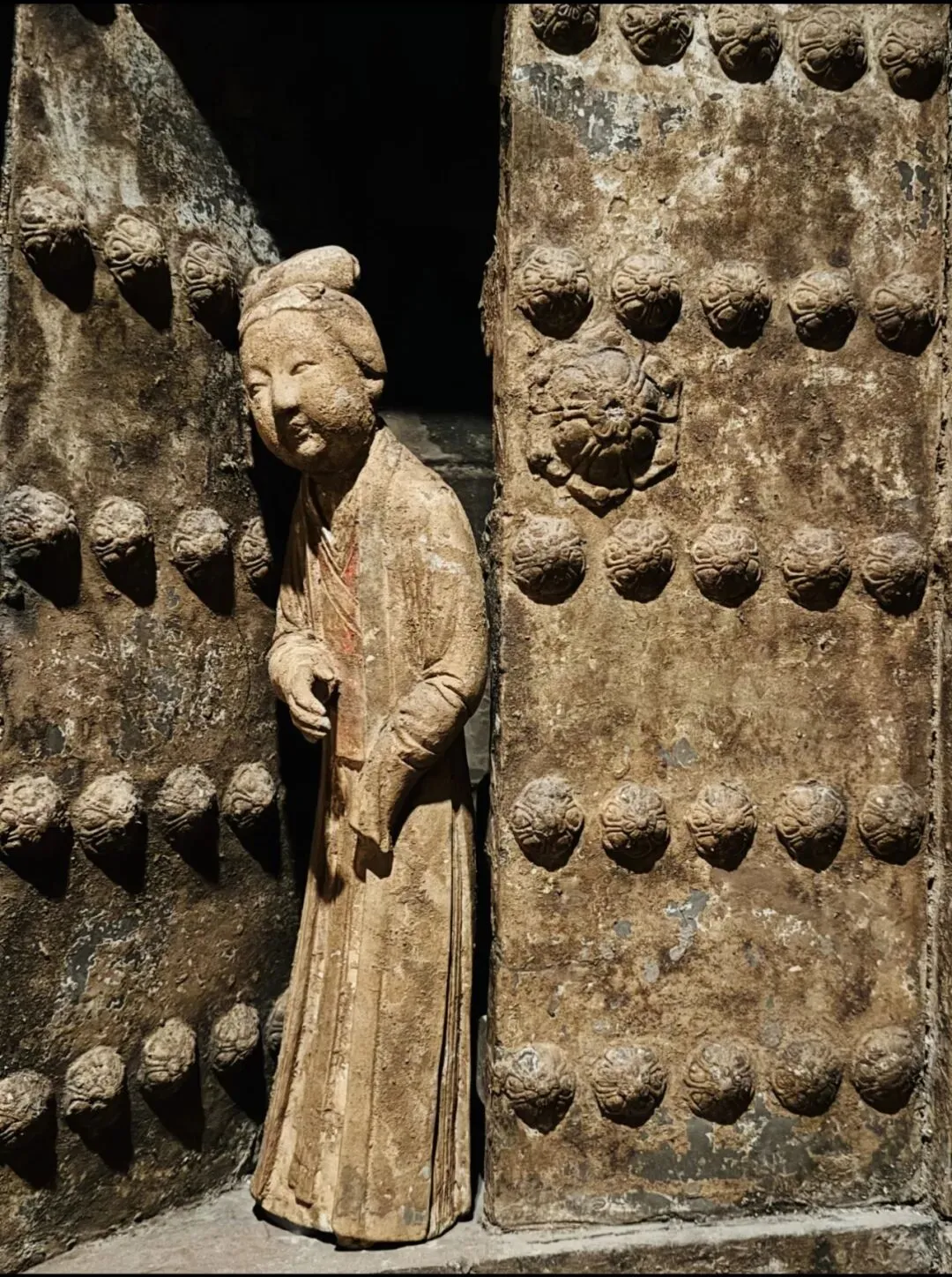 妇人启门砖雕,这一题材在古代墓葬中应用广泛,最早可追溯至汉代。通过半遮半掩的状态,强烈暗示门后尚有另外世界,给人无限遐想。当现世的繁华可能在战乱中消逝,人们便将这份对美好生活的执念,刻入永恒的砖石之中。壁画中精细刻画的门窗、斗拱、桌椅、屏风,不单是建筑构件,更是宋代家居文化的实证。墓葬壁画中极力铺陈的宴饮欢乐、家庭和睦、孝悌传承的主题,也体现了对太平生活的眷恋与珍视。