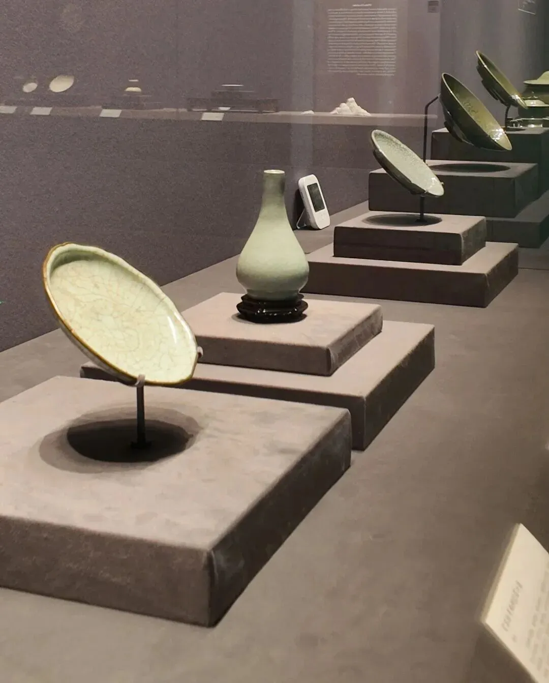 代表性的展品是南宋官窑灰青釉胆式瓶和粉青釉荷叶式洗,它们体现了宋代文人清雅含蓄的审美追求。