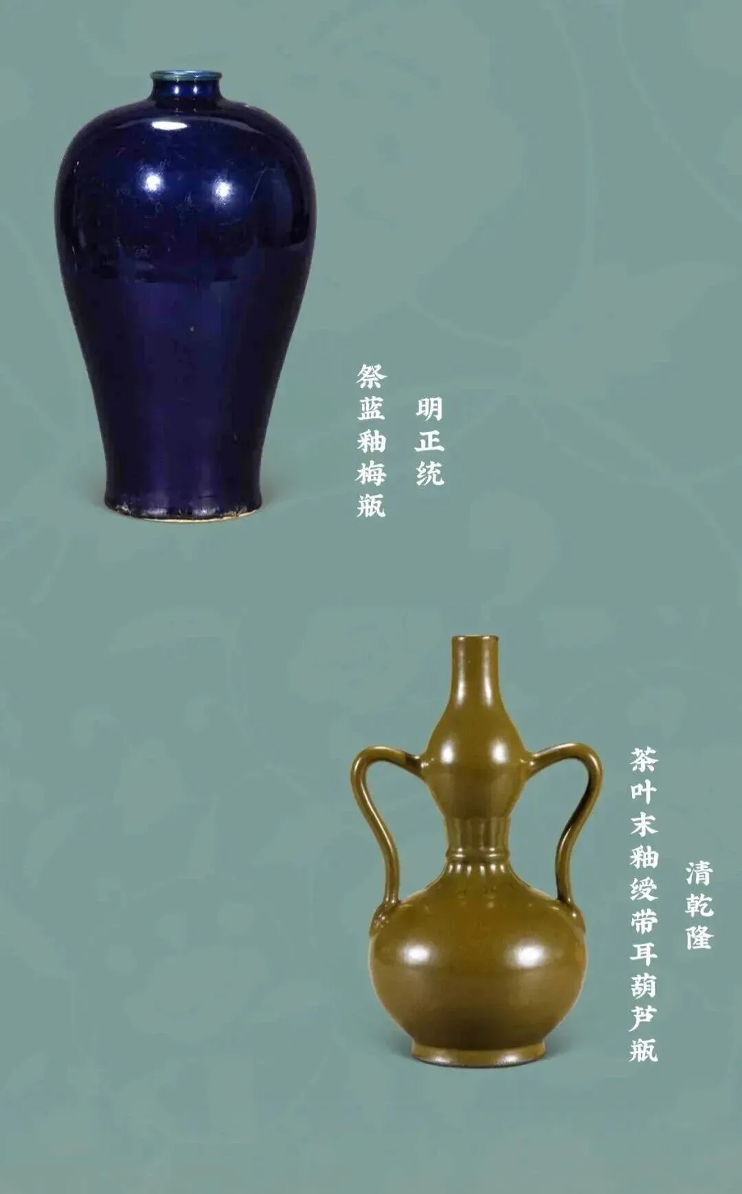 展品中明正统祭蓝釉梅瓶深沉均匀的霁蓝釉色,清乾隆茶叶末釉绶带耳葫芦瓶黄绿掺杂如茶叶细末的独特质感,都是窑变艺术的杰出代表。