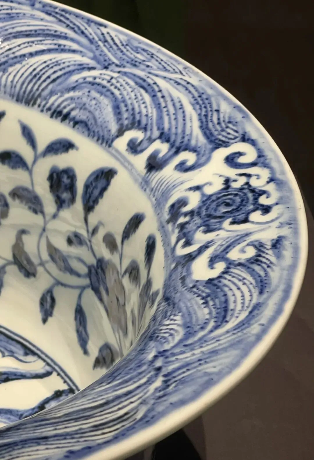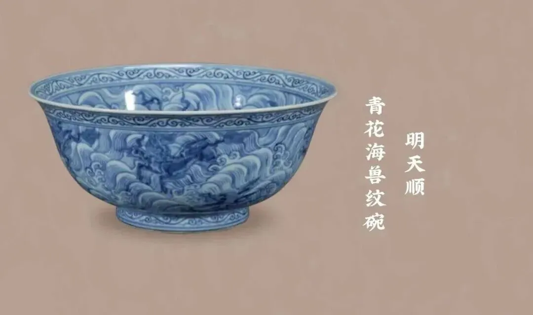 第三单元是“凝粹·多彩”,呈现青花彩瓷的繁复之工。这类瓷器融合了南青北白的极简之美与高温窑变的天然之奇,诠释“无美不臻”的极致追求。其中明天顺青花海兽纹碗,以进口“苏麻离青”料绘制,发色浓艳,铁锈斑深入胎骨,海兽在波涛中腾跃的姿态充满动感,是这一单元的亮点展品。