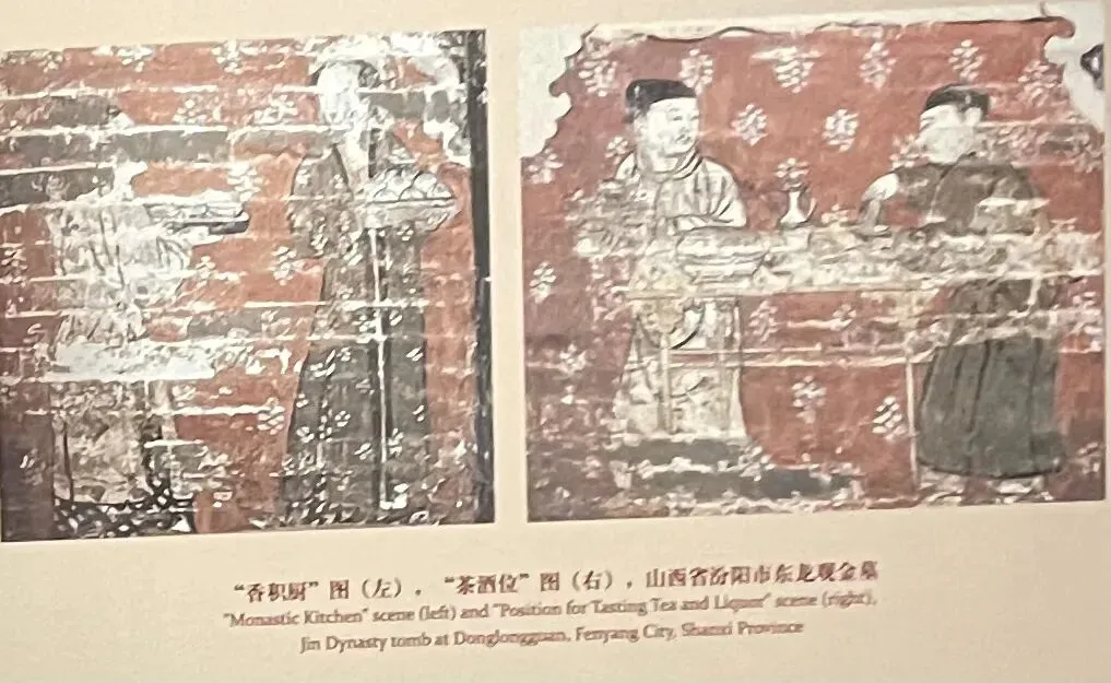 在这些被精心构建的“家”中,生活场景被永恒定格:“开芳宴”中夫妇并坐,面前杯盘罗列;庖厨内仆人执刀俎,灶火正旺;散乐杂剧的艺人正在表演……它们共同构成了一幅“家居生活图鉴”。我注意到壁画中的器物,桌上的注子、温碗、果盘,其形态与“珍瓷萃美”展中的实物几可对应。