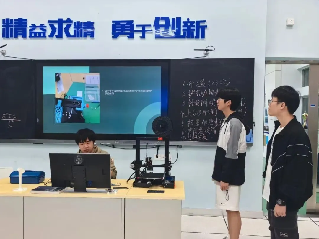 学生在3D打印课堂动手拆装3D打印机,进行优化设计汇报