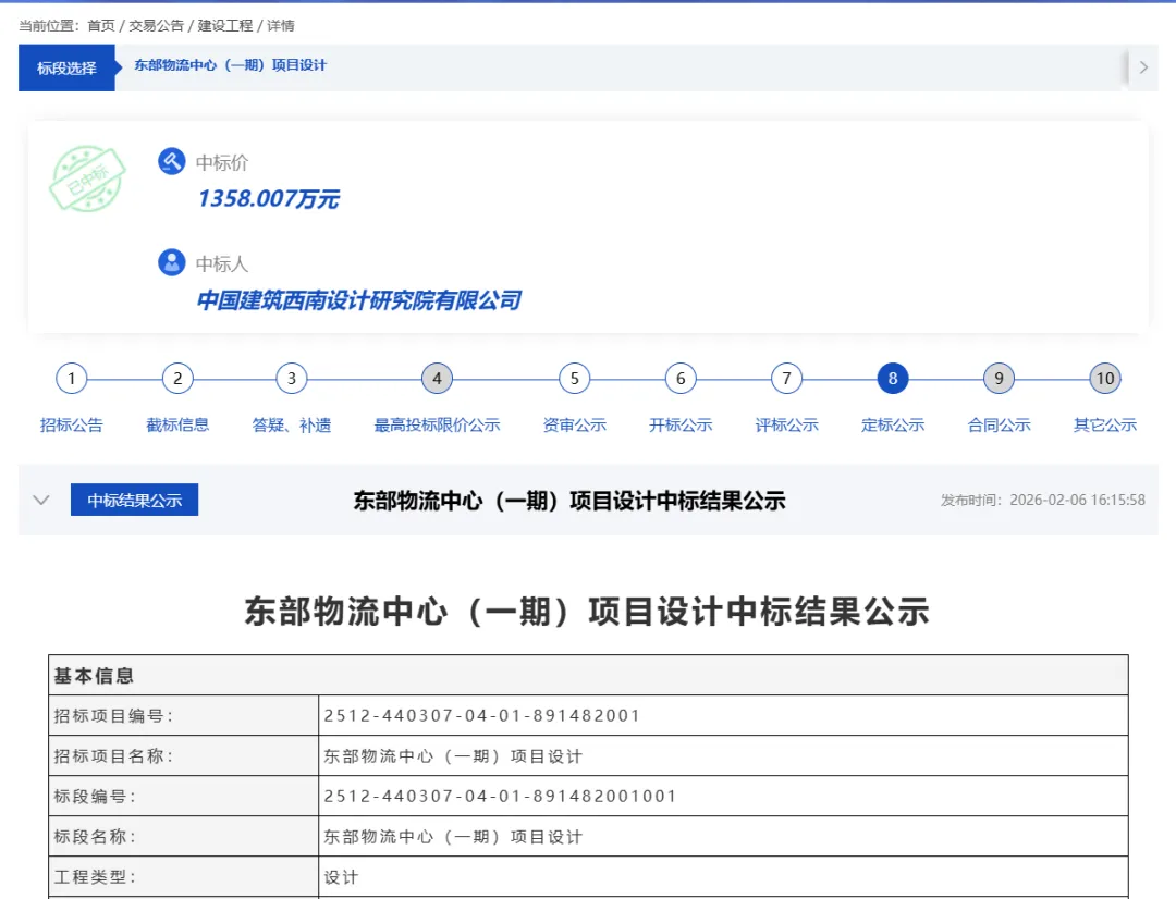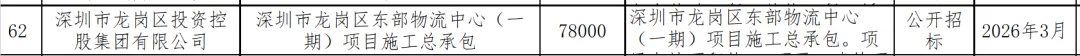 近日,深圳市龙岗区投资控股集团有限公司发布启动东部物流中心(一期)项目设中标结果,计划总投资84,000万元,其中,设计招标金额1532.488万元,中标价格1358.007万元,中标单位中国建筑西南设计研究院有限公司。地址深圳市龙岗区宝龙街道。 本次中标内容:包括但不限于方案设计阶段、初步设计阶段、施工图设计阶段、专项设计阶段、施工服务阶段和运营前期配合阶段,按国家有关规程规范的要求应由设计单位完成的工作,提交报政府相关部门审核通过及备案的设计成果,提供配合施工单位编制竣工图设计等后续服务。内容详见设计任务书。本次中标范围:建筑设计,方案设计,初步设计,施工图设计,施工现场服务。 龙岗区住房和建设局发布的关于2026年年度及2026年1-3月份龙岗区建设工程招标计划的公示,可知。深圳市龙岗区东部物流中心(一期)项目施工总承包计划在2026年3月进行,计划招标金额78000万元。