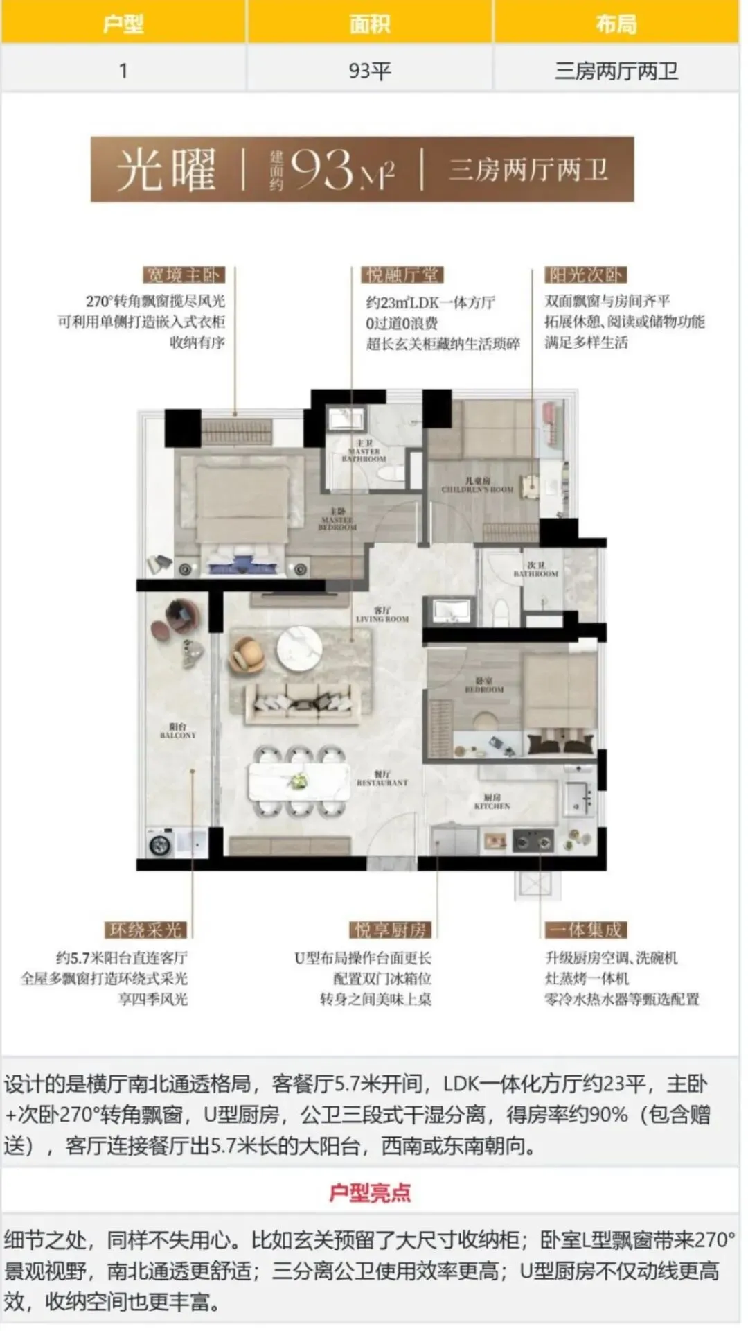 93㎡的3房2厅2卫,2栋1/2单元05户型/2栋3单元02户型,设计的是竖厅格局,LDKB一体化设计,动静分区,三开间朝南,主卧+次卧270°转角飘窗,U型厨房,公卫三段式干湿分离,得房率约90%(包含赠送),西南或东南朝向。