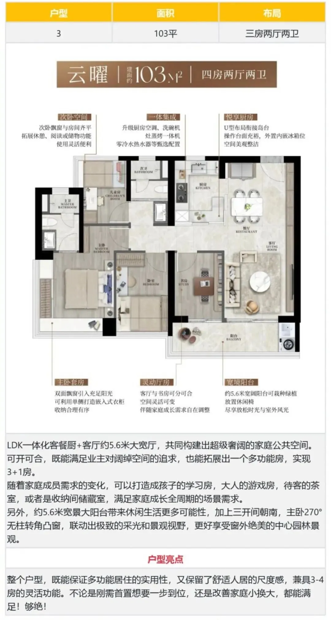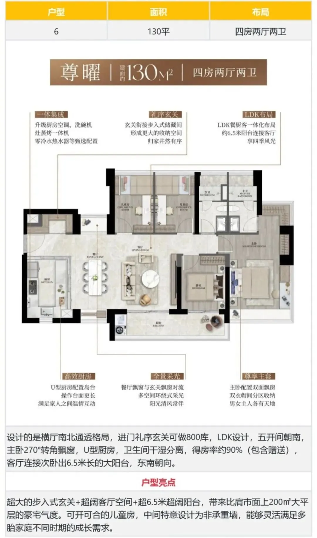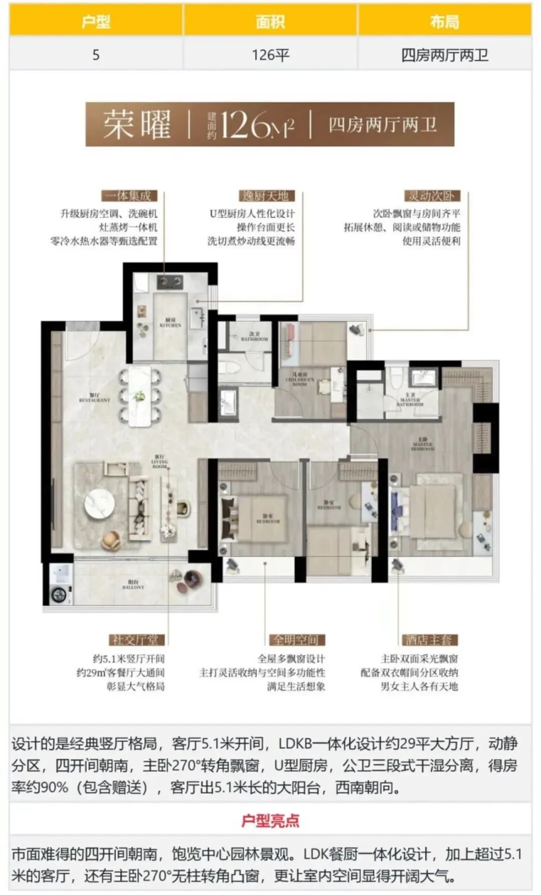 103㎡的4房2厅2卫,设计的是竖厅格局,LDKB一体化设计,动静分区,四开间朝南,主卧270°转角飘窗,U型厨房,公卫三段式干湿分离,得房率约90%(包含赠送),客厅连接餐厅出5.6米长的大阳台,西南或东南朝向。107㎡的4房2厅2卫,设计的是竖厅南北通透格局,客餐厅分离设计,四开间朝南,主卧270°转角飘窗,U型厨房,公卫三段式干湿分离,得房率约90%(包含赠送),客厅连接餐厅出6.1米长的大阳台,西南朝向。126㎡的4房2厅2卫,设计的是经典竖厅格局,客厅5.1米开间,LDKB一体化设计约29平大方厅,动静分区,四开间朝南,主卧270°转角飘窗,U型厨房,公卫三段式干湿分离,得房率约90%(包含赠送),客厅出5.1米长的大阳台,西南朝向。130㎡的4房2厅2卫,设计的是横厅南北通透格局,进门礼序玄关可做800库,LDK设计,五开间朝南,主卧270°转角飘窗,U型厨房,卫生间干湿分离,得房率约90%(包含赠送),客厅连接次卧出6.5米长的大阳台,东南朝向。楼盘交通四通八达,“六线七站”汇聚,现地铁4号线、6号线;22号线、25号线、27号线、深大城际规划中,龙胜站、龙华站、上芬站、景龙站、油福站、油松站、银泉站7站环绕,可实现5站直达福田。让通勤不再是疲惫的消耗,而是高效、从容的场景切换。