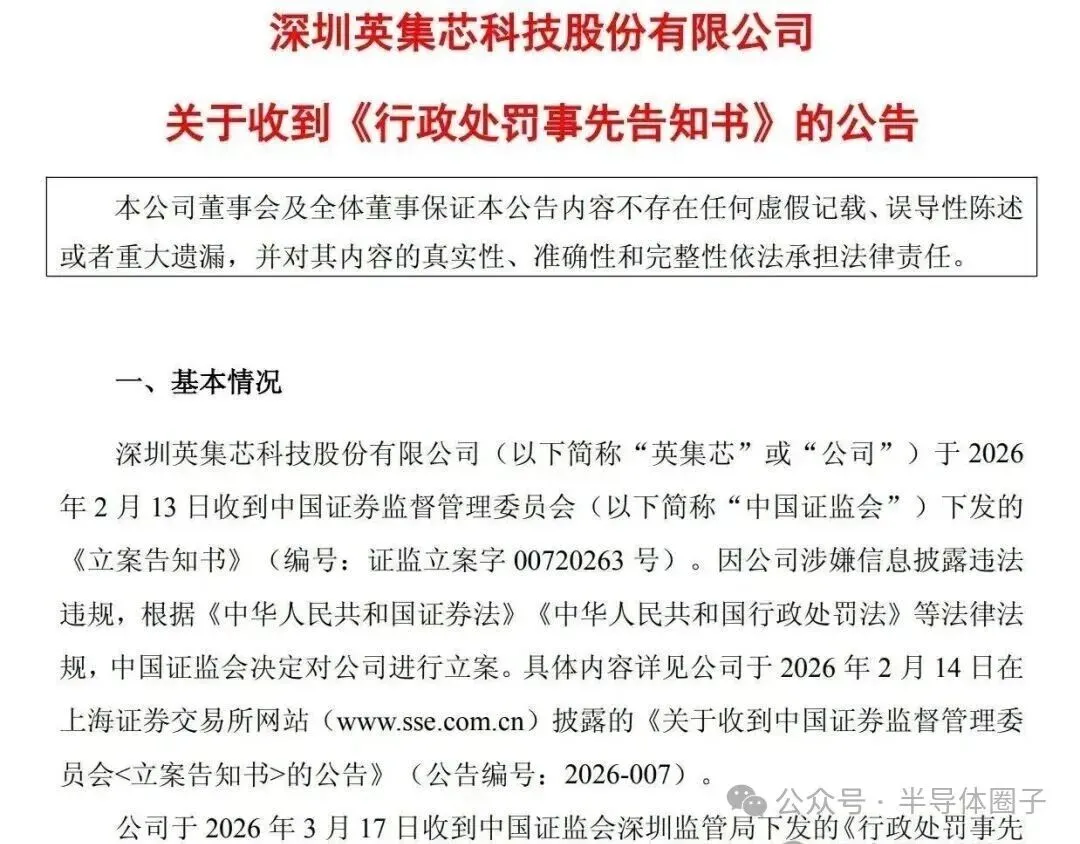 《行政处罚事先告知书》显示,经查明,2026年1月5日,英集芯人为策划以“自问自答”方式,在上海证券交易所e互动平台发布“公司在脑电信号采集等核心芯片方面的产品进展与后续规划”的提问,并于次日盘后回复称“公司通过早期投资布局,已涉足脑机接口芯片领域。公司推出的IPA1299是一款8通道、低噪声24位ADC芯片,专用于人体生物电信号的高精度测量,可适用于脑电信号采集等脑机接口相关场景。IPA1299芯片已量产出货,性能参数可媲美海外头部芯片产品”。