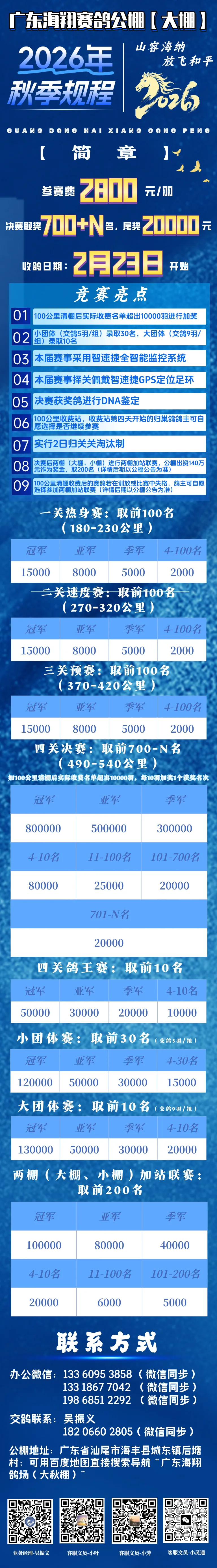 2.小团体(交鸽5羽/组)大棚录取30名,小棚录取20名,大团体(交鸽9羽/组)录取10名