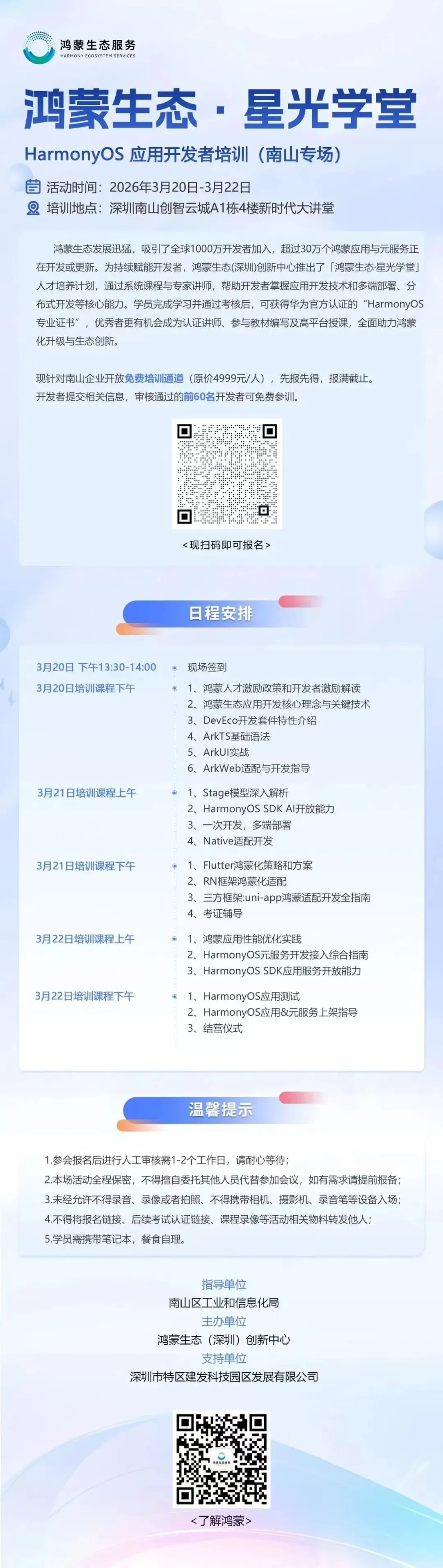 本周深圳迎来“高能周末”,从北大汇丰的AI思想盛宴,到免费的鸿蒙官方培训;从地缘政治下的投资策略,到儒家智慧的心灵栖所。小编为您精选了8场不容错过的活动,请查收这份周末日程表。① 鸿蒙生态·星光学堂:HarmonyOS应用开发者培训(南山专场)