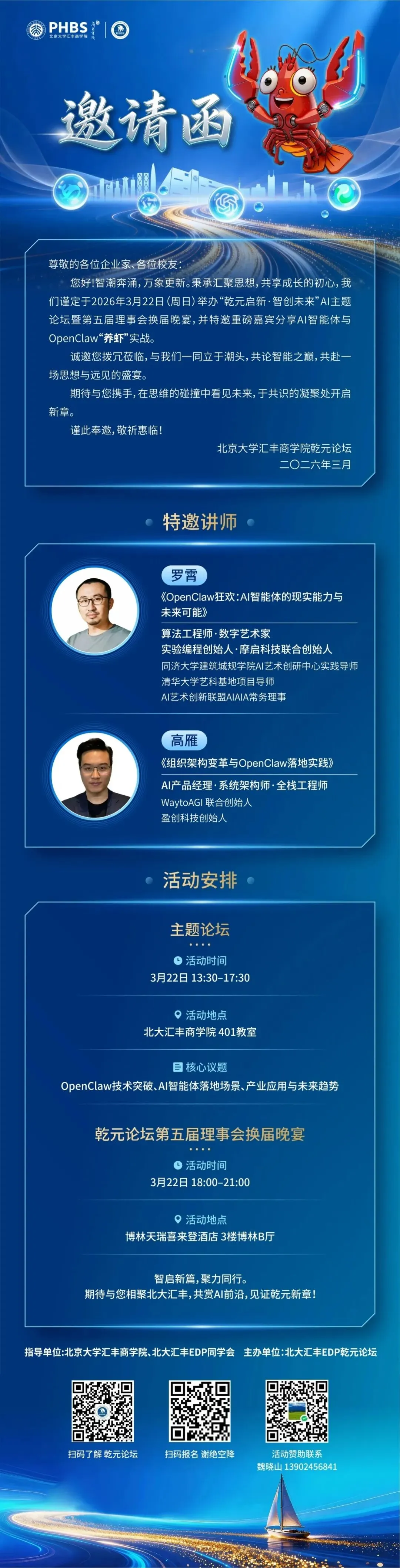时间:3月22日(周日)13:30-21:00 (论坛13:30开始,晚宴18:00开始)地点: 北大汇丰商学院401教室(论坛地点) / 博林天瑞喜来登酒店(晚宴地点)