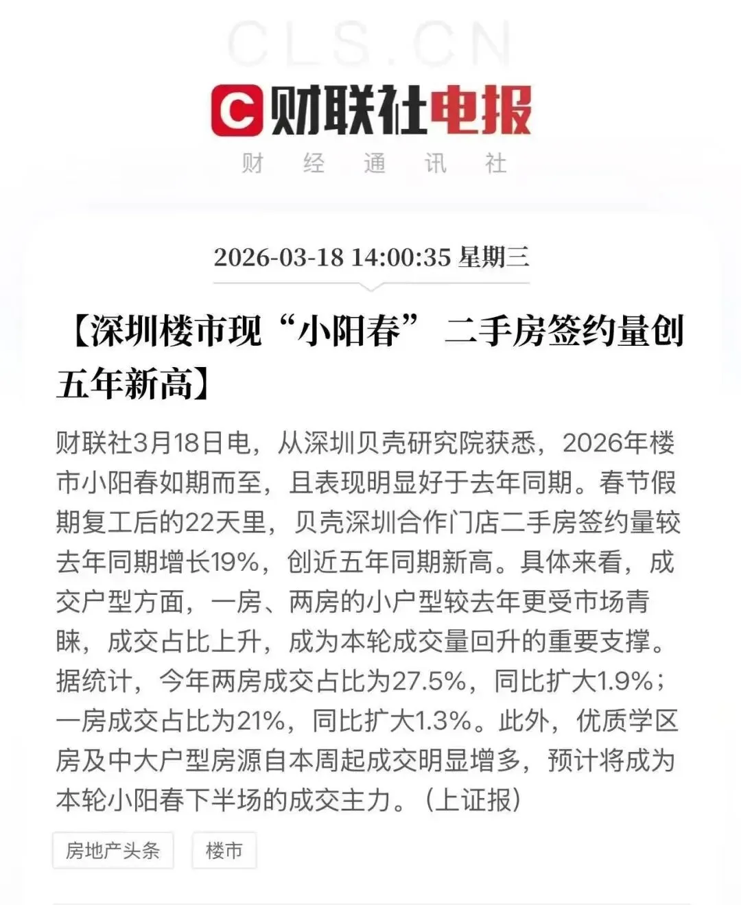 2026年开春,深圳楼市暖意渐浓。据财联社3月18日援引深圳贝壳研究院数据,春节假期复工后的22天里,贝壳深圳合作门店二手房签约量同比增长19%,创下近五年同期新高。