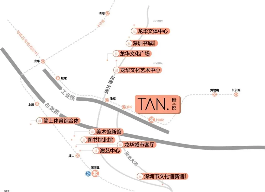 3公里范围内有龙华文化广场、龙华文体中心、深圳书城-龙华城、深圳市美术馆新馆(试运营)、深圳市图书馆北馆 (试运营) 、深圳市文化馆新馆 (建设中) 等市政级文化配套、超核绿心公园。