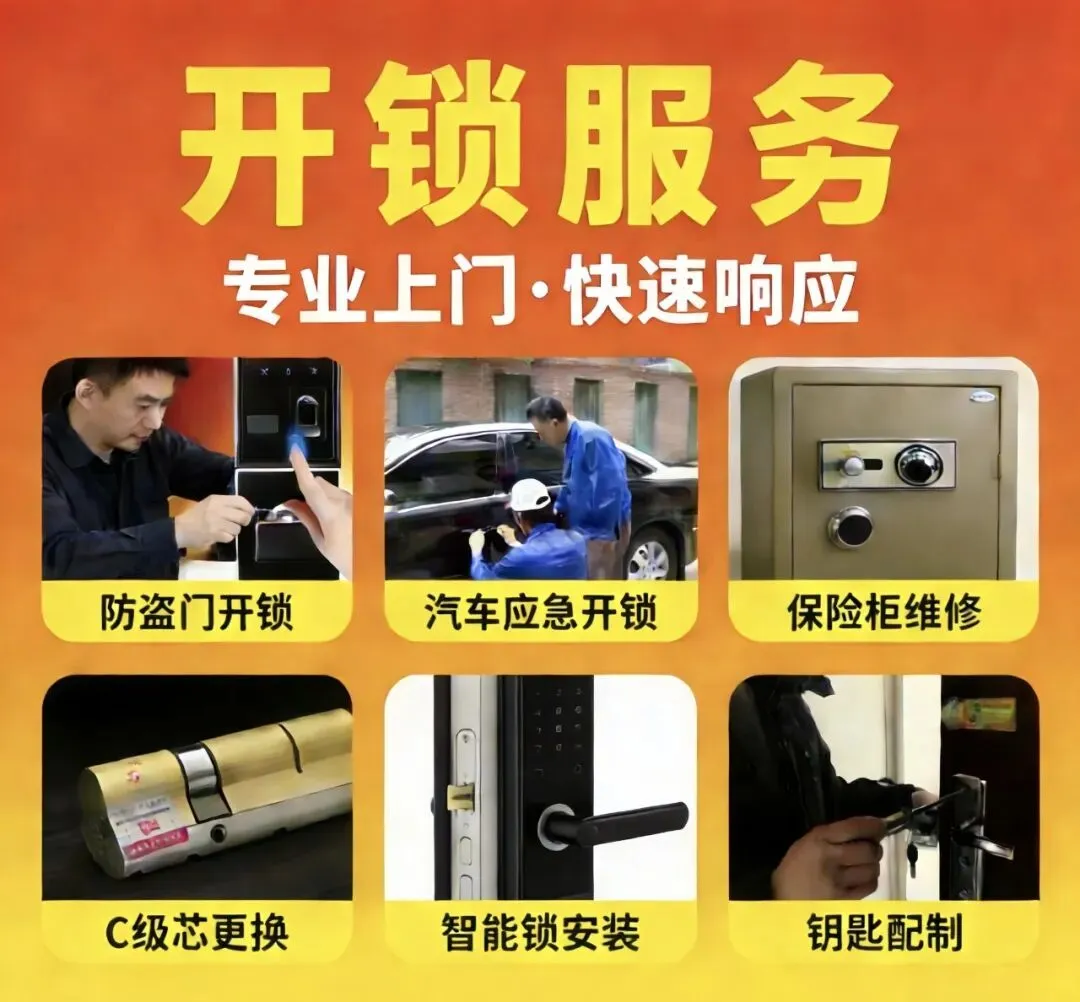 居家 / 商业 / 汽车锁具应急全解决:防盗门反锁、指纹锁失灵、钥匙断芯 / 丢失、老人小孩误锁,商铺卷帘门 / 门禁锁故障、汽车钥匙锁车内 / 芯片匹配等各类问题,📞400-000-7366 快速响应,核心城区 10 分钟上门,高效化解各类锁具难题。