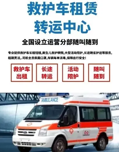 我们是救护车出租转运公司,120救护车接送病人预约护送。24小时为术后康复、危重患者及跨区域就医人群提供专业医疗转运服务,提供120救护车出租‖救护车转运‖私人120救护车(非急救)‖跨省长途转运‖危重病人转运‖市内转运‖术后康复病人转运‖高铁病人转运‖患者返乡‖大型活动赛事保障‖配备ICU设备:呼吸机▪心电监护仪▪吸痰器•微量泵•氧气▪急救药箱▪专业医护团队