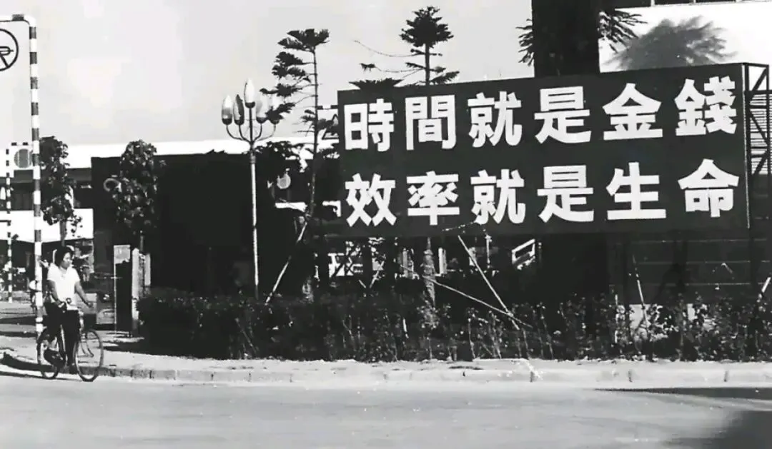 8.1986年,行人从张贴着醒目标语的蛇口工业区办公楼外骑车经过。