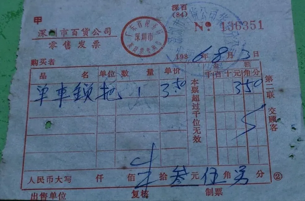 12.1986年,深圳市百货公司零售发票(单车锁)。