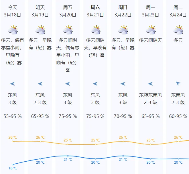 据“深圳天气”消息,深圳将告别前段时间的晴燥,暖意伴着湿气正缓缓上线。18-23日湿度逐渐加大,云量增多,天气渐转潮湿,间中有零星小雨,早晚有(轻)雾。