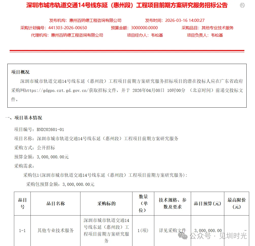 重磅!深圳地铁14号线东延(惠州段)正式启动前期方案研究服务招标!