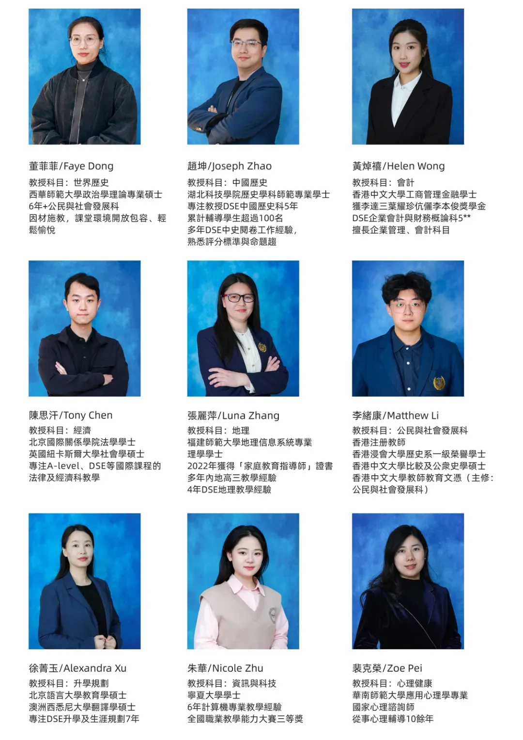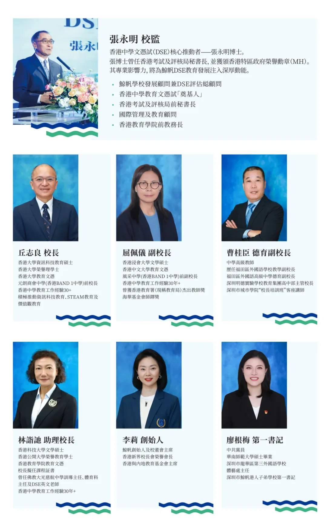 鯨帆港人子弟學校由具豐富教育管理經驗的香港校長團隊全權領導,確保學校以專業及國際化視野穩健發展。教師團隊均擁有多年教授HKDSE課程的經驗,深諳考評要求與學習策略,為學生提供專業指導與個性化支持,助力他們在公開考試及未來升學道路上脫穎而出。