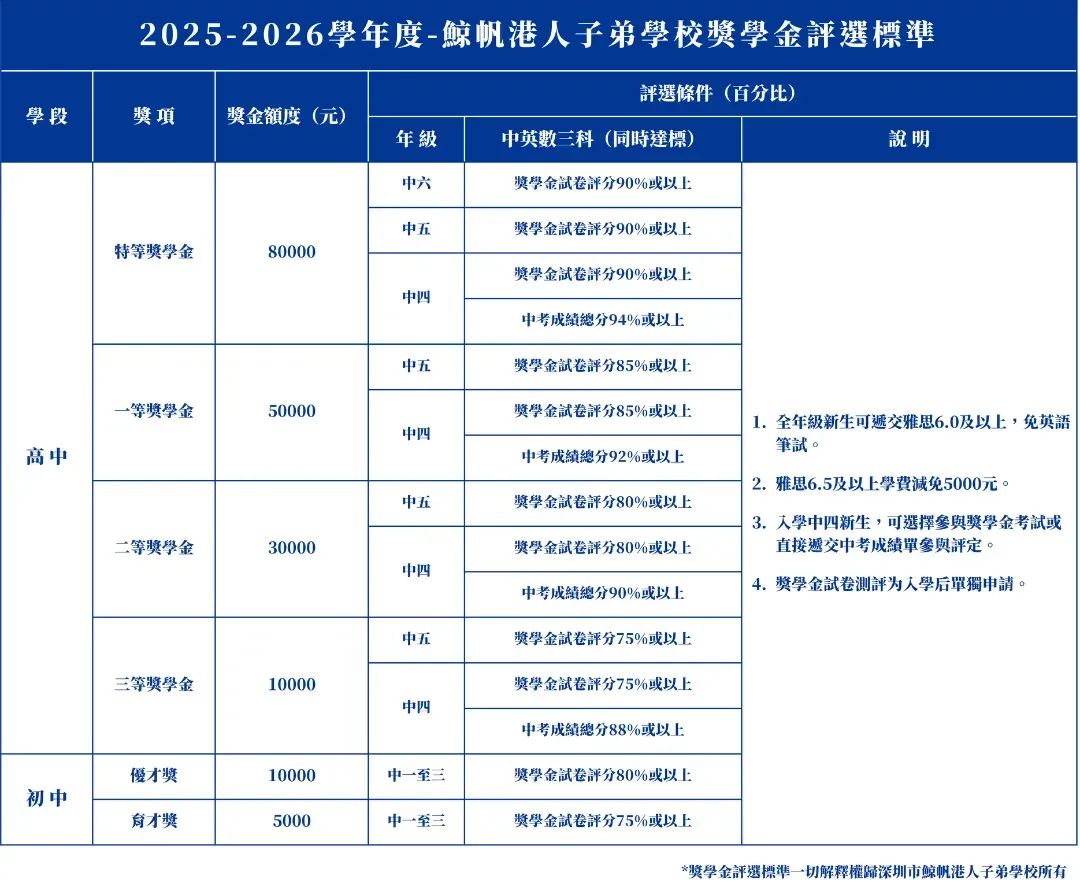 學術類:中考獎學金(秋季入學適用):當地中考成績每門 ≥88%,可獲得學費減免。