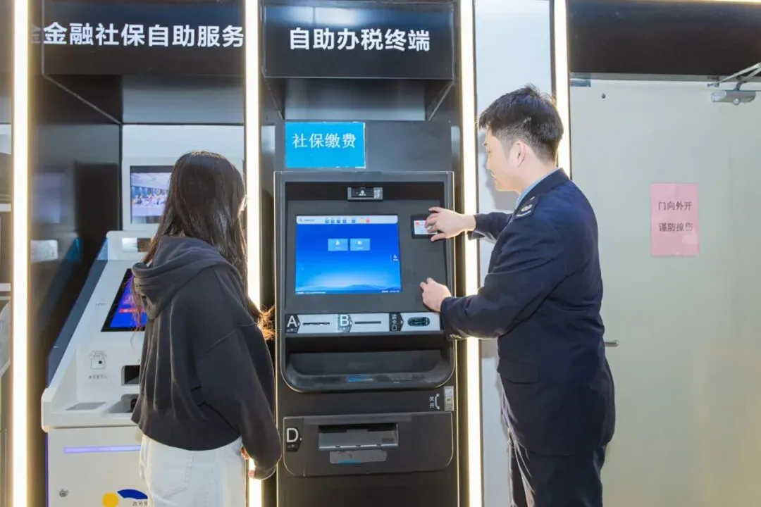 深圳市龙岗区税务局税务干部辅导缴费人通过自助办税缴费终端缴纳社保费。