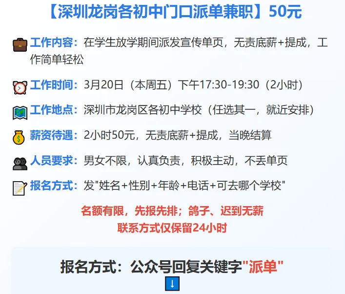 >【深圳兼职】龙岗45家学校招兼职啦!2小时50元+提成,当晚即刻结算薪资~在学生放学期间派发相关宣传单页.