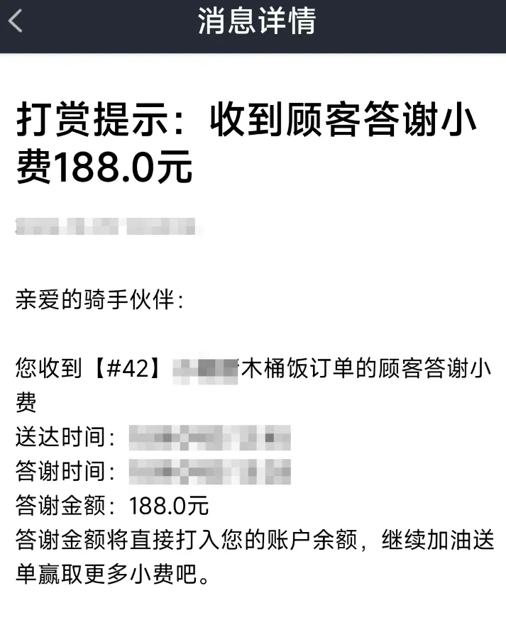 要知道,小哥送这一单,配送费可能也就几块钱。这188元,顶得上他跑几十单了。