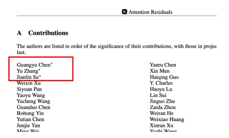 经核实,“Guangyu Chen”即陈广宇。论文附录显示,他与张宇、苏剑林三人被标注为“同等贡献”,位列共同一作。张宇是Kimi高效模型架构的重要研究者,苏剑林则是提出了被主流大模型广泛采用的旋转位置编码(RoPE)的知名研究者。